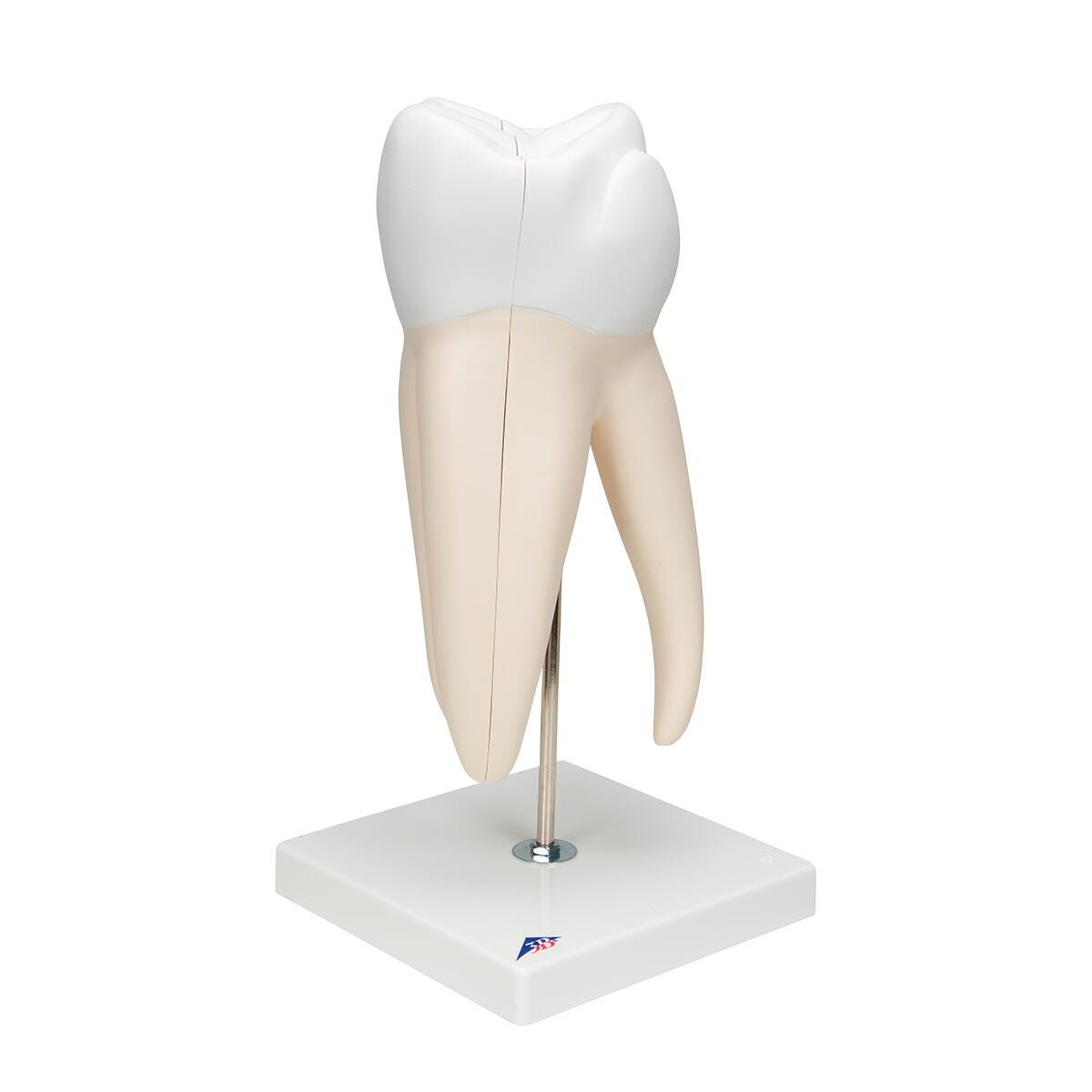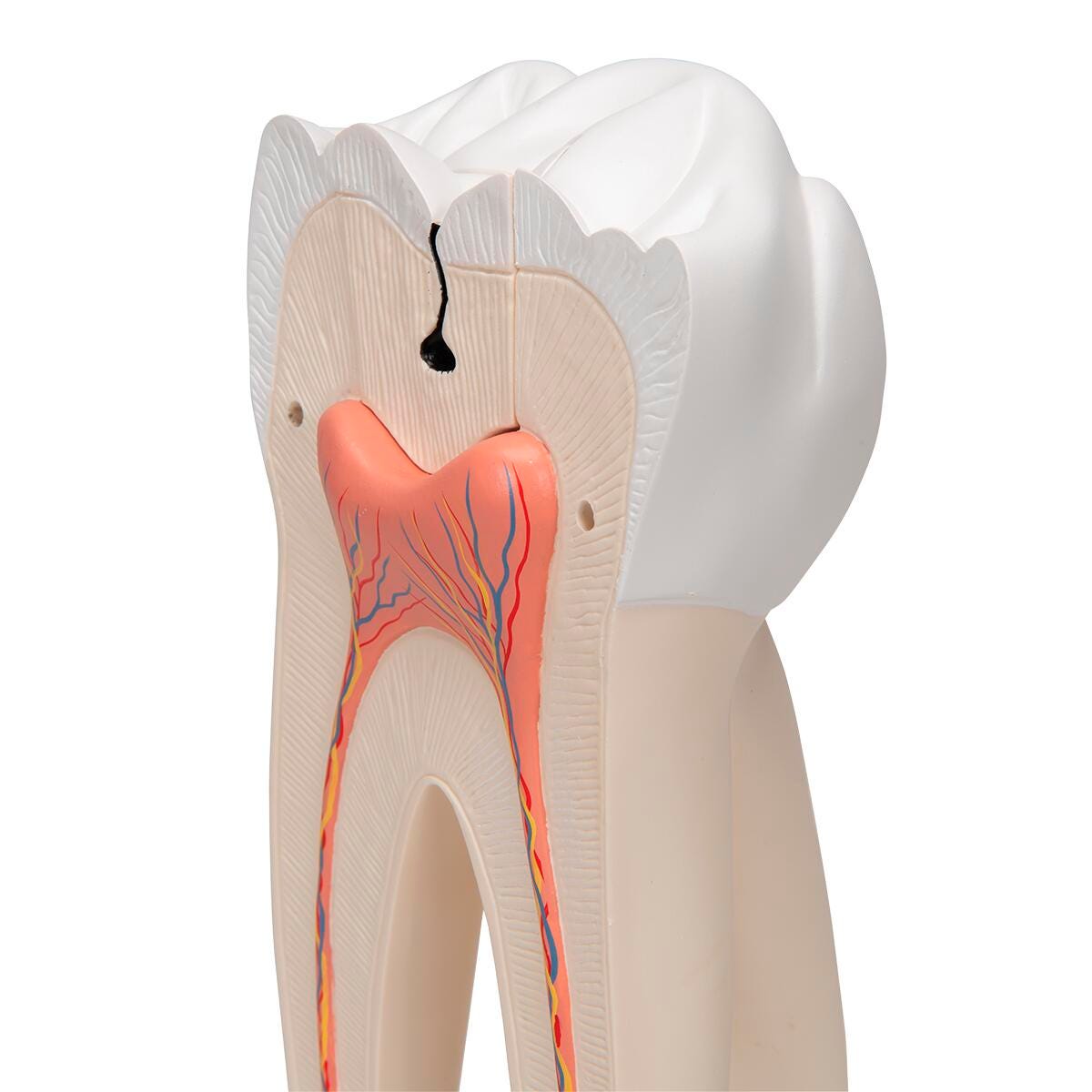 American 3B Scientific Giant Molar with Cavity model depicts an upper triple-root molar and separates into 5 parts. The molar features a longitudinal section through the crown, two roots and the pulp cavity. The giant molar contains removable pulp and three tooth inserts with different stages of advanced cavities. Giant molar with dental cavities on stand.