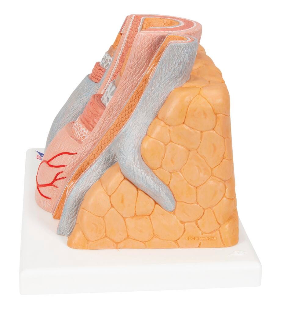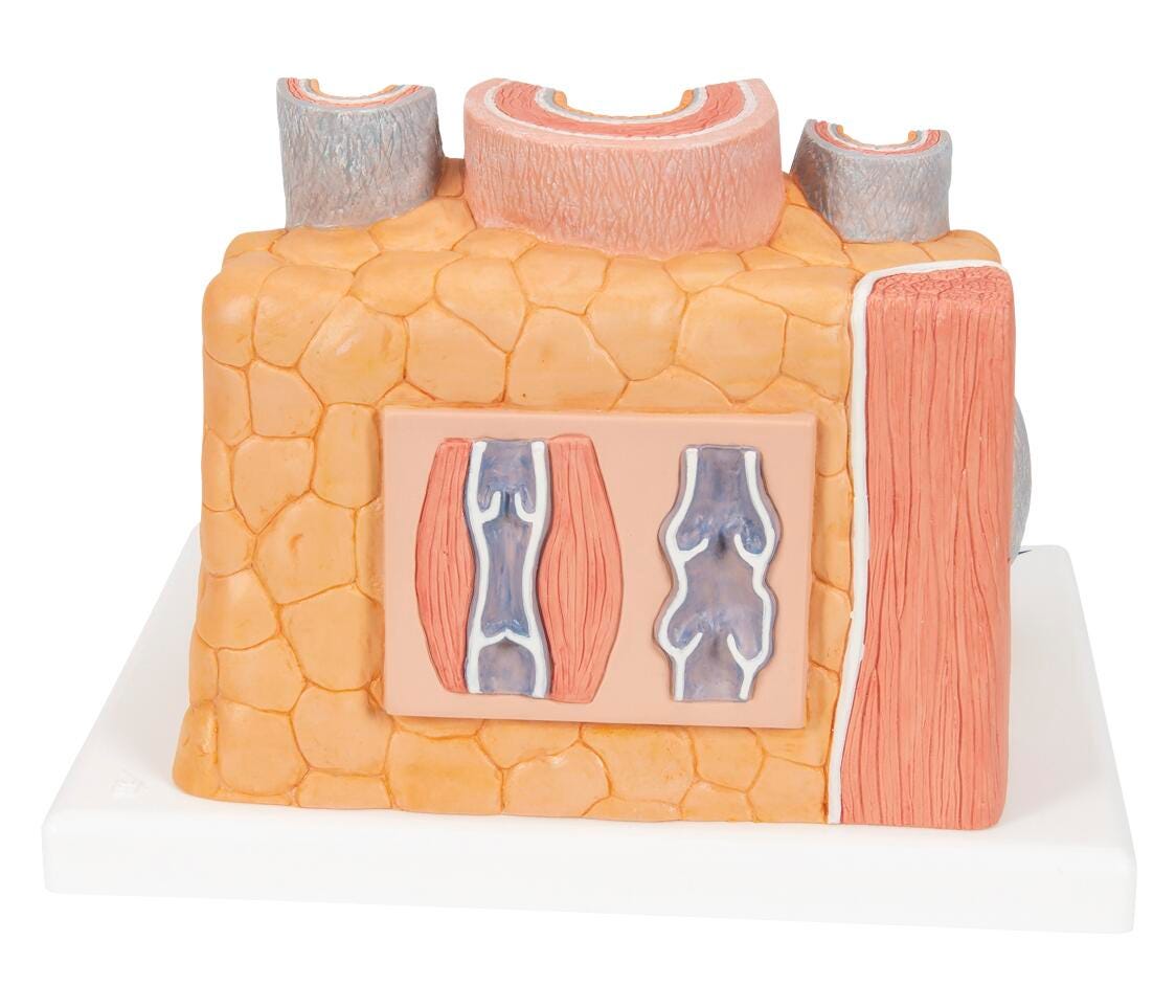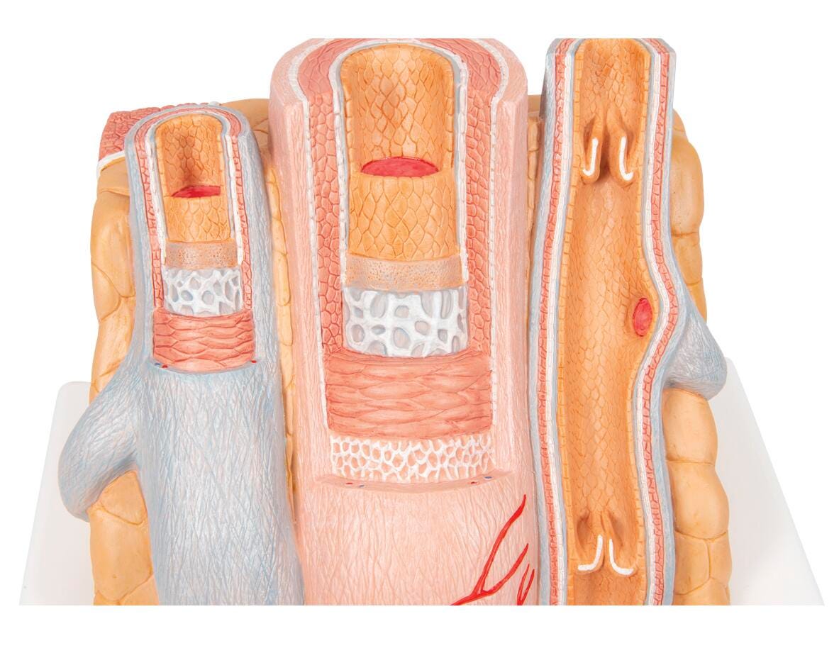 American 3B Scientific MICROanatomy Artery and Vein Model shows a medium-sized muscular artery with two adjacent veins from the antebrachial area with adjoining fat tissue and muscle enlarged 14 times. The MICROanatomy circulatory system model illustrates the reciprocal anatomical relationship of artery and vein and the basic functional techniques of the venous valves.