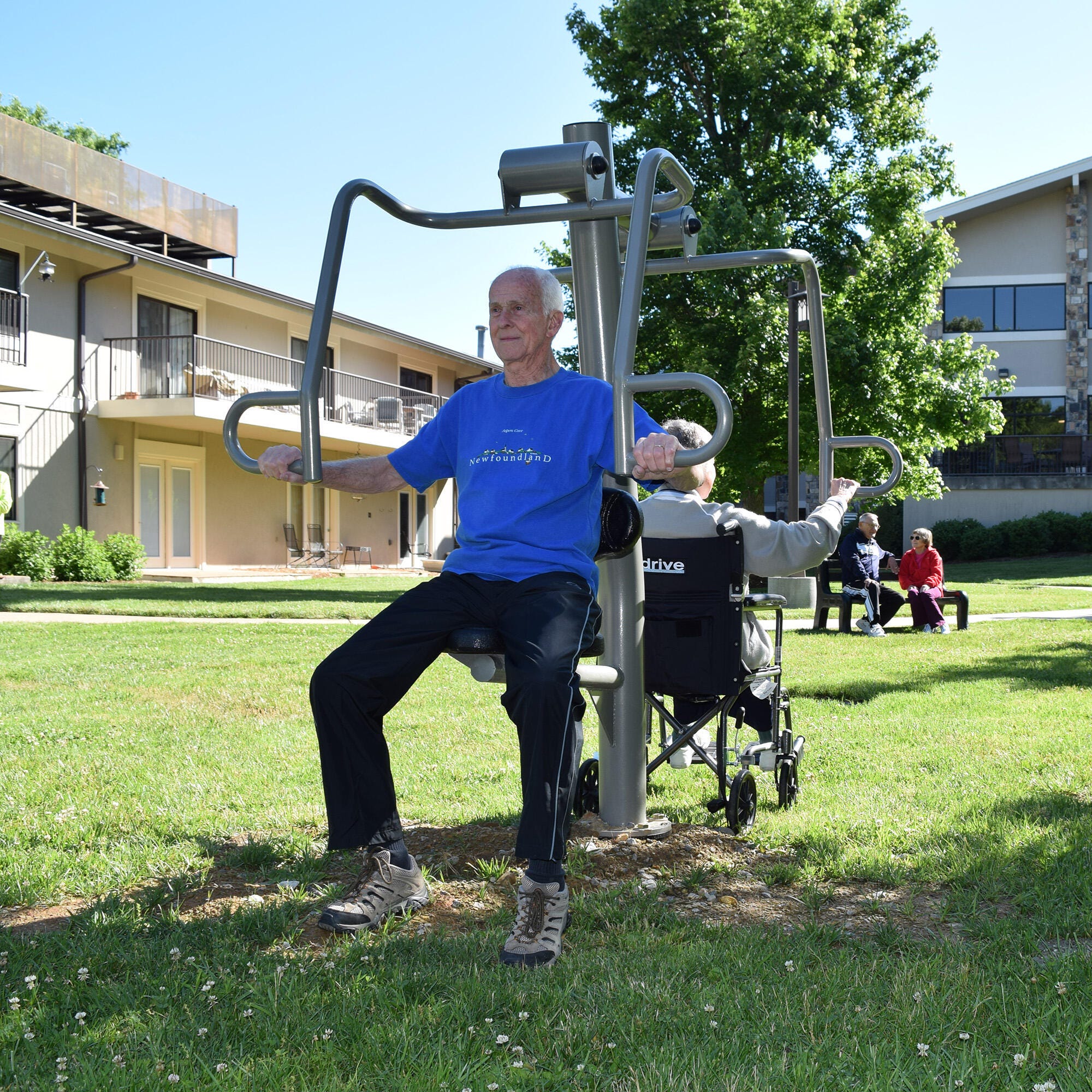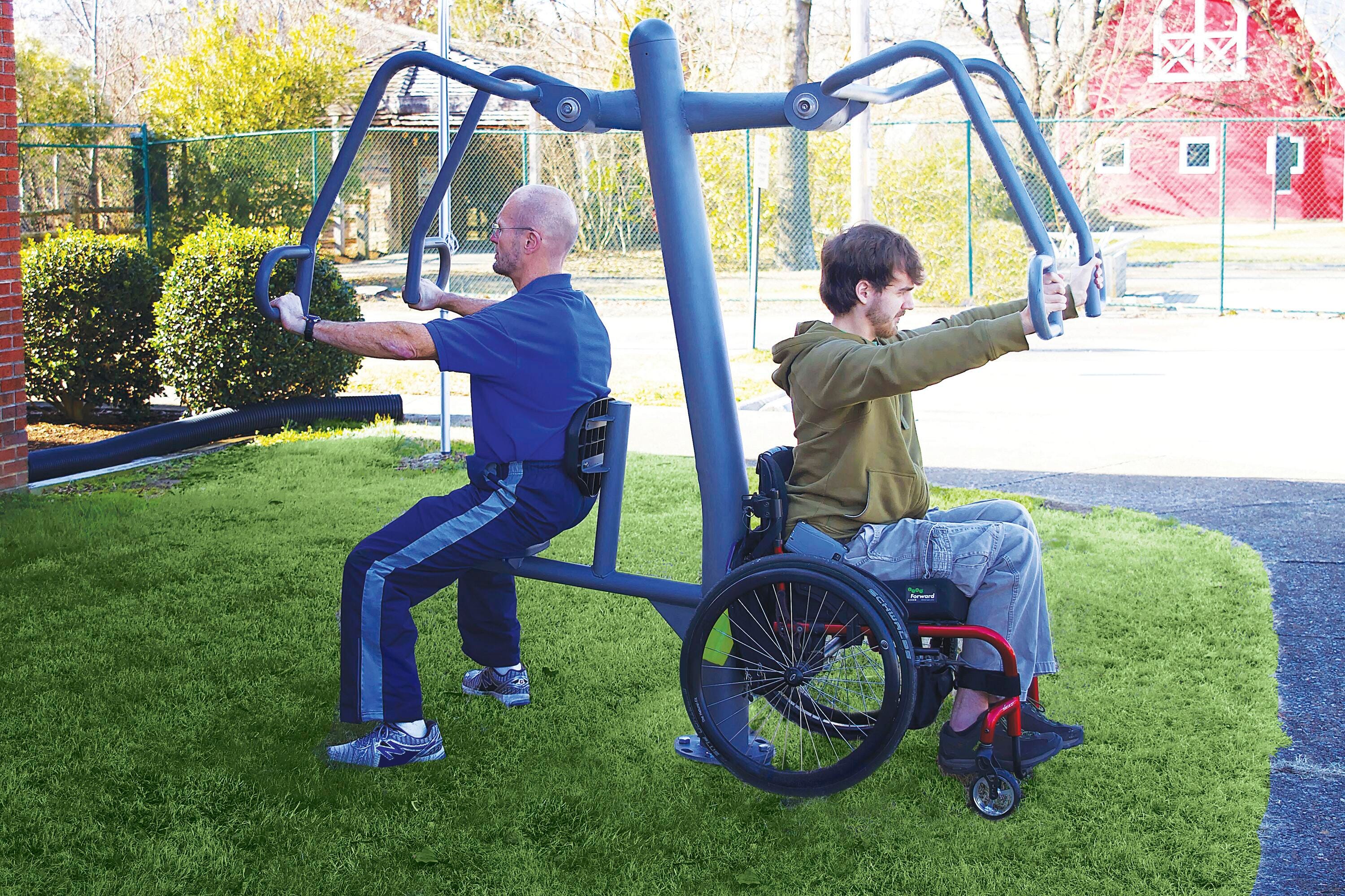 The ADA accessible chest press by ActionFit enables users in mobility devices to remain seated or sit on the ergonomically designed seat and push the non-slip handles outward. This fitness station was designed with isokinetic springs that activate to provide smooth resistance and workout-targeted strength training zones. It is designed for ages 13 and up making it perfect for upper middle and high school campus gyms or exercise areas.