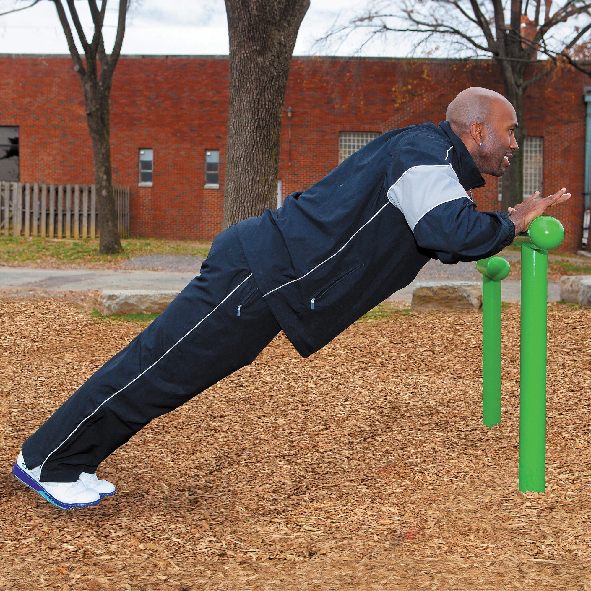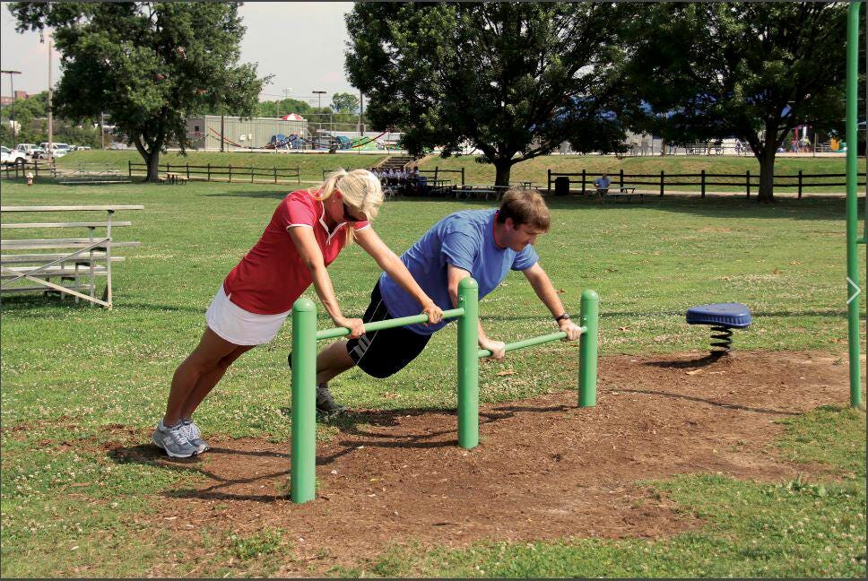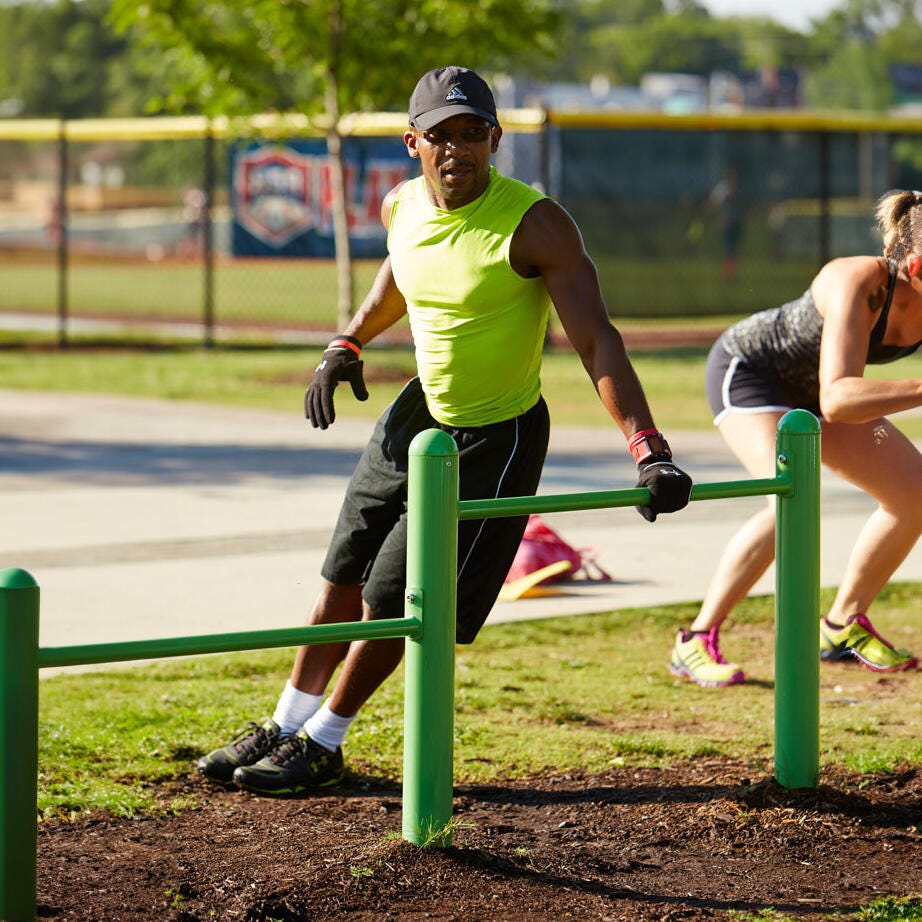 The ActionFit crosstrainer push-up station is an exercise favorite for building muscle strength as it targets the arms, back, and core. The student or adult users can grip the bar and bend their arms to slowly lower their body until their chest is slightly above the bar. Using strength, the user then pushes upward returning to the starting position. This fitness station is designed for ages 13 and up making it perfect for upper middle and high school campus gyms or exercise areas.