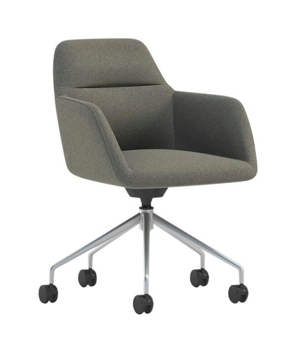 A comfortable, durable seat that will turn heads wherever its placed. Juggle’s fully upholstered, contoured, one-piece shell supports a variety of working postures from classroom to boardroom, for waiting room seating and beyond. Subtle details include a single tuft line across the back and full, upholstered arms designed for comfort. This chair has a five-star swivel base equipped with casters for mobility and a 360-degree spin, optimal for dynamic workspaces or computer labs. This design comes with a silver base frame. Measures 23 W x 26 D x 32 H inches. Available in four fabric colors: Ash, Cayenne, Denim, and Taupe. Please select the color that suits your space best when ordering.Features