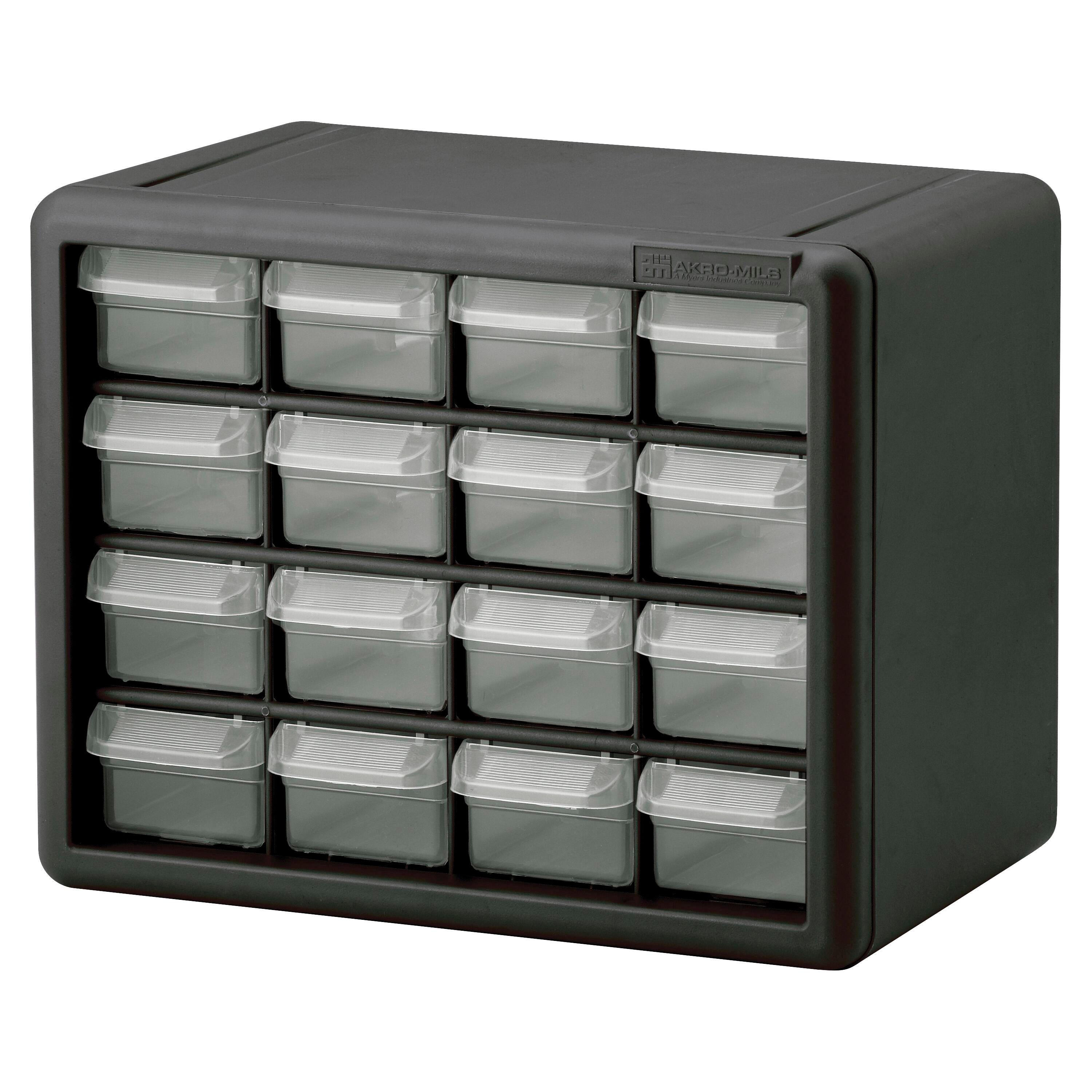 Akro-Mils 16-Drawer Plastic Storage Cabinet is perfect choice for organizing and protecting your small supplies as well as other components. Cabinet is securely stackable and wall-mounted with keyhole slots. It incorporates 16 combo dividable drawers to increase storage options. Clear polypropylene drawers help for easy content identification. Finger-grip drawer pulls are perfect to offer easy access. The rear stop tabs are suitable for preventing content from spilling. Frame features one-piece, high-impact polystyrene construction to offer enhanced durability. 6-3/8 in x 10-1/2 in x 8-1/2 in. Grey.