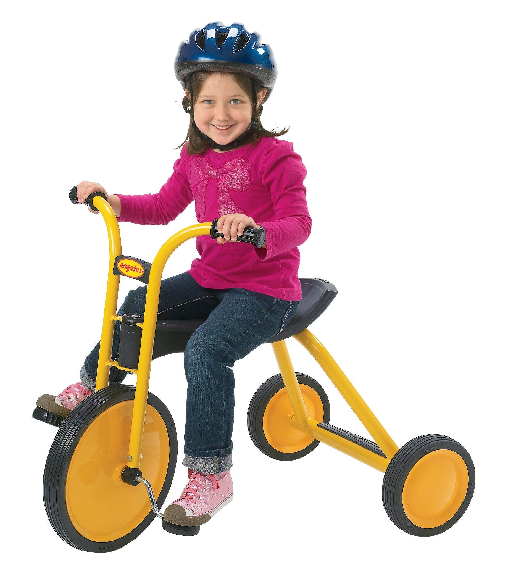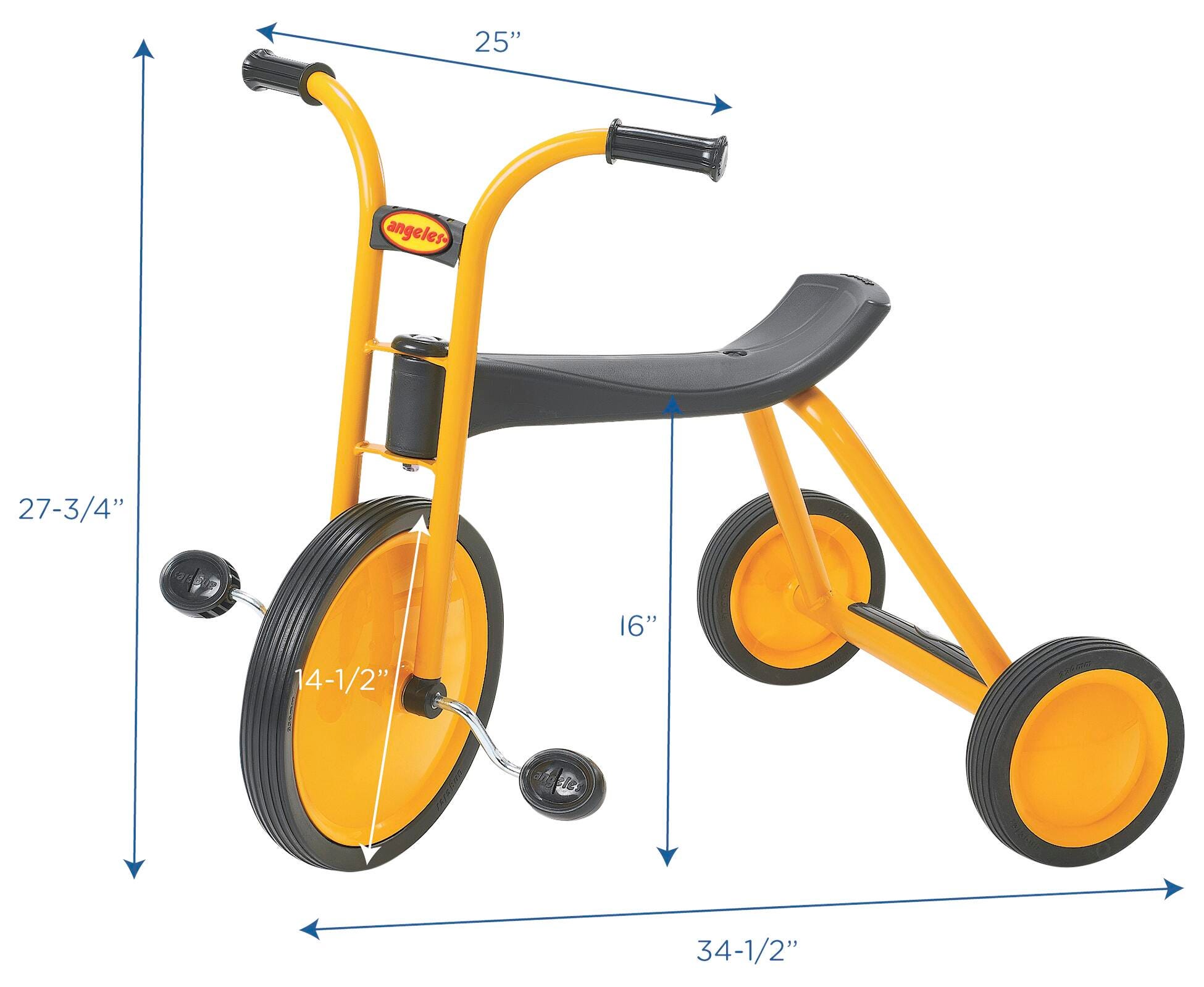 MyRider Maxi is perfect for little riders! The seat measures 16 inches high, the front wheel measures 14-1/2 inches in diameter, and the handlebars measure 27-3/4 inches high. All MyRider trikes feature the innovative Vario Seat to accommodate children of different sizes. The yellow powder-coated steel frame resists rust and supports children up to 70 pounds. Trikes also feature sturdy, solid tires on spokeless wheels and a no-pinch design. Easy 1-bolt assembly is required. Trikes should be stored indoors.