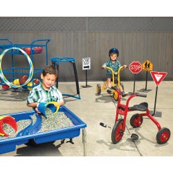 Create a realistic roadway for young riders and teach road safety with our Traffic Signs! These signs are designed to be used outdoor with their weatherproof design, made no-tip to withstand even the windiest days. The road signs for children are made of sturdy, weatherproof plastic, designed for outdoor use at preschools, daycare centers, and playhouses. Each sign measures 11 L x 11 D x 29 H inches each.Features