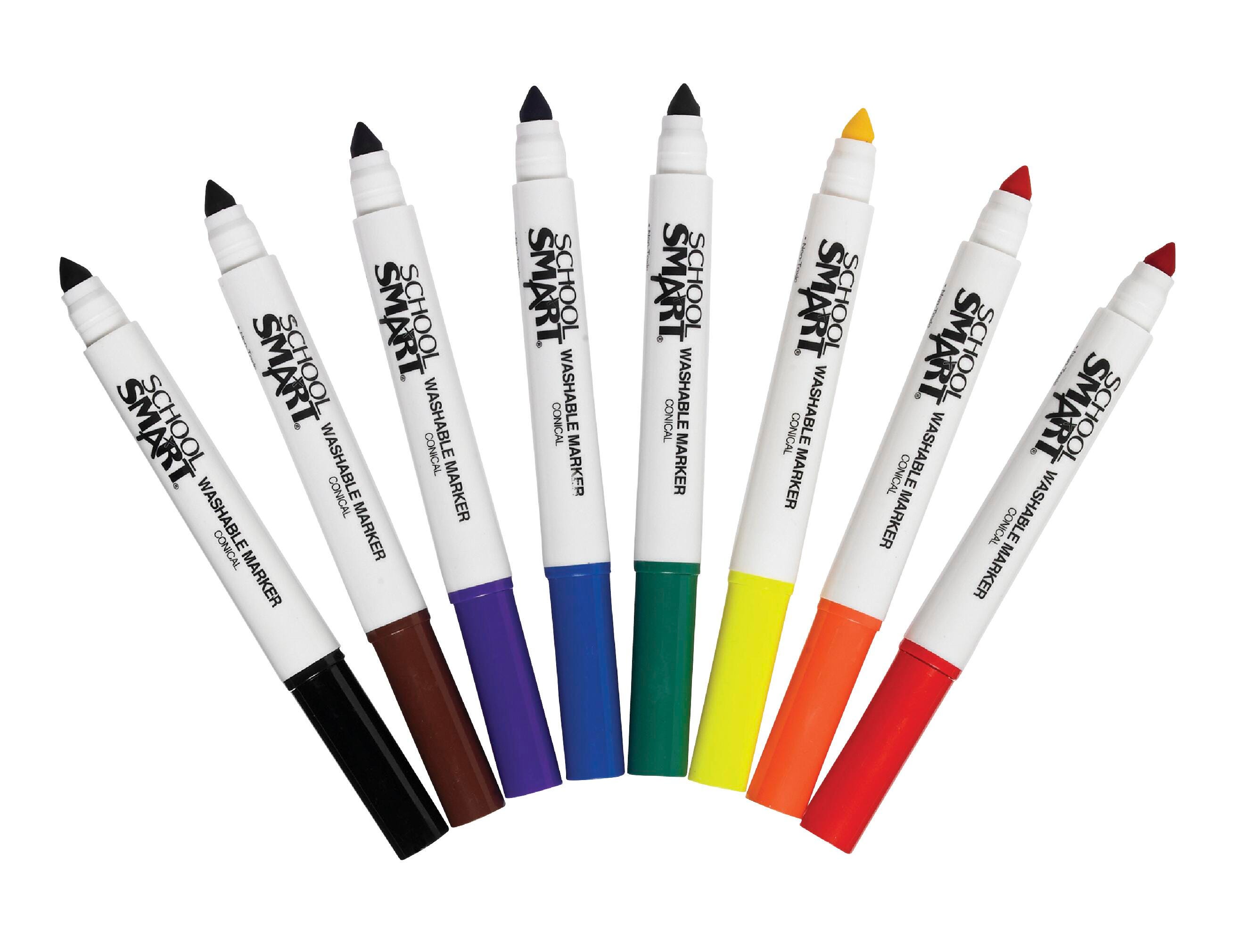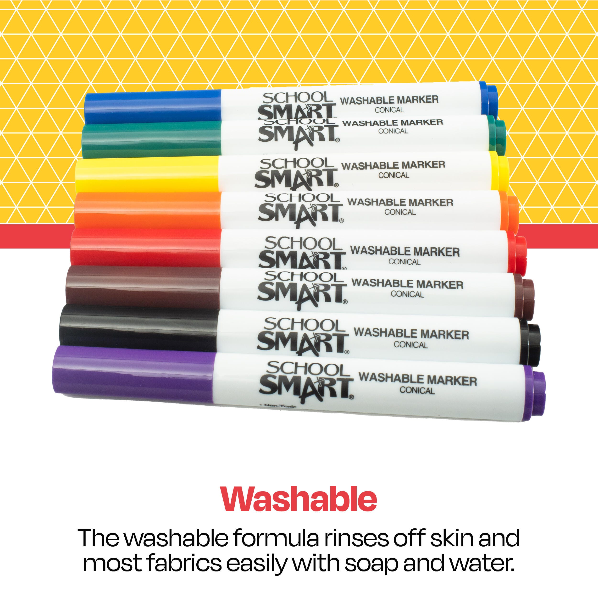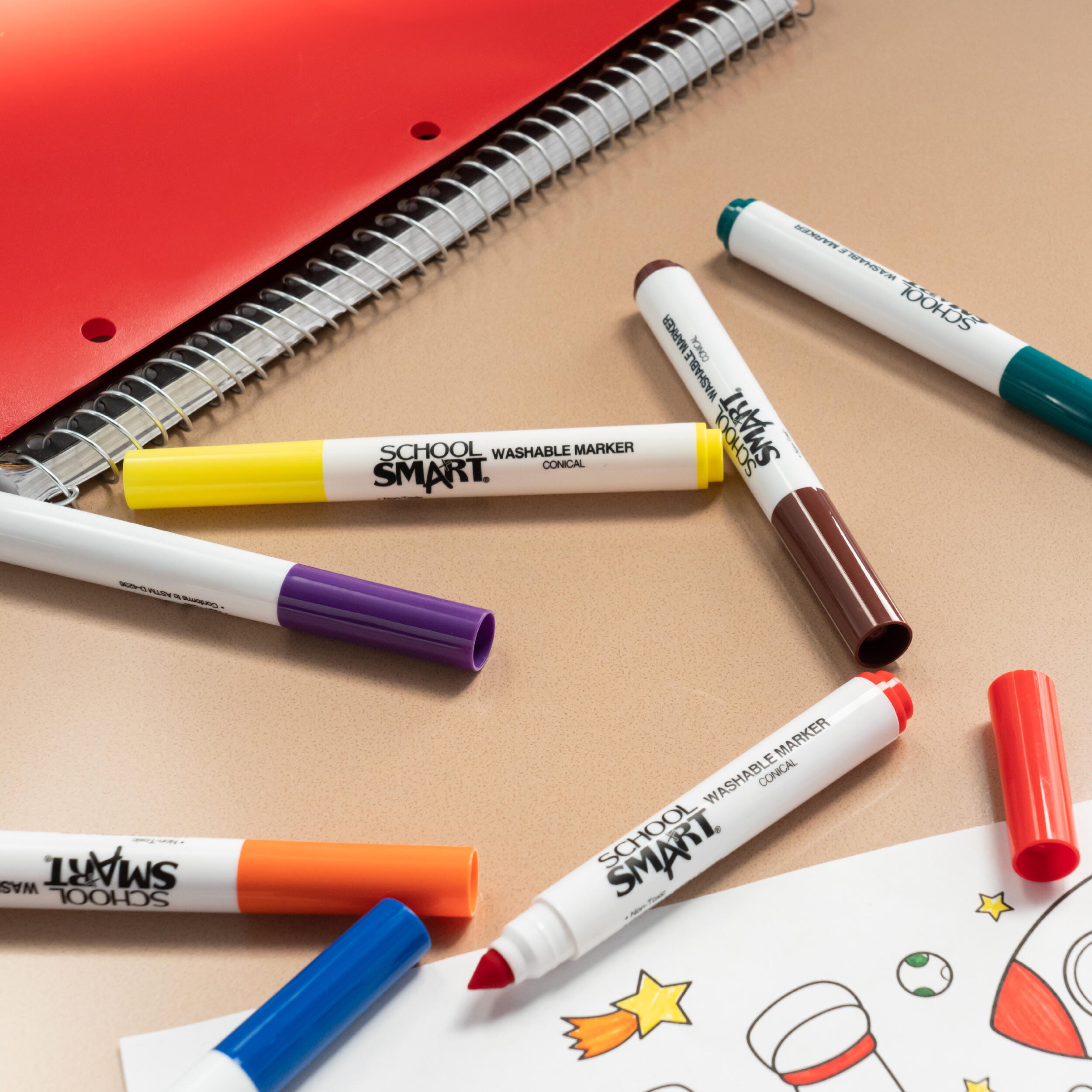The School Smart washable markers bulk pack is perfect for sharing in the classroom with 200 classic markers. Especially great for young children, our classroom markers dry quickly and wash easily from skin and many fabrics. The art markers glide smoothly on paper to prevent smudging and create bold, vibrant colors, plus the high-quality design holds up to active daily use without wearing down. Medium-sized conical tips create evenly smooth lines and work well for everyday drawing, coloring, or detailed work. Turn the tips on their sides to create broad-lined strokes or color large surfaces. This value set of easy-to-wash markers comes in vibrant colors with 25 each of the following: black, red, blue, green, yellow, purple, orange, and brown.