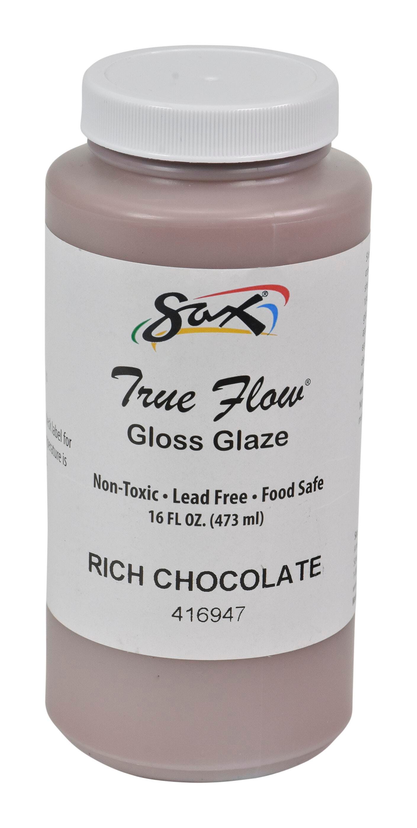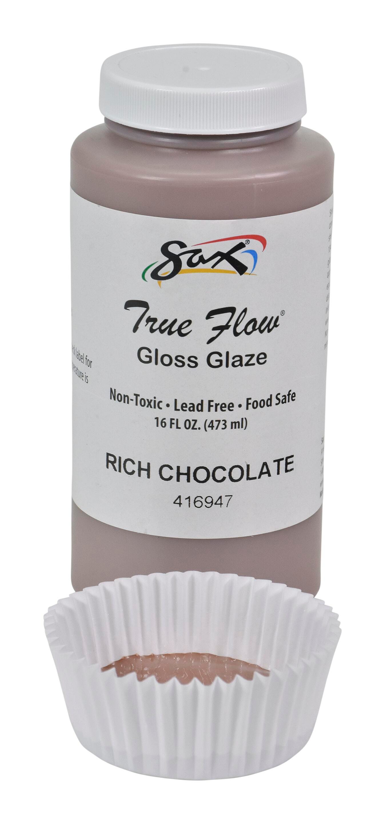 The Sax gloss glaze in opaque Rich Chocolate is a high-quality glazing paint that's dinnerware safe when fired to cone 06-05. During application, the glaze may be a different color and will change to the desired look after the required kiln firing. The color lightens when fired at cone 6.