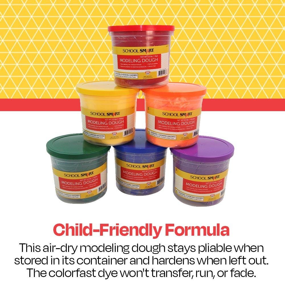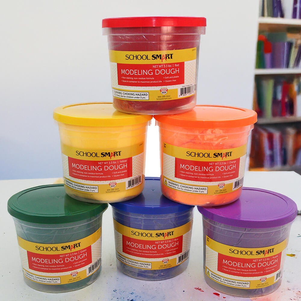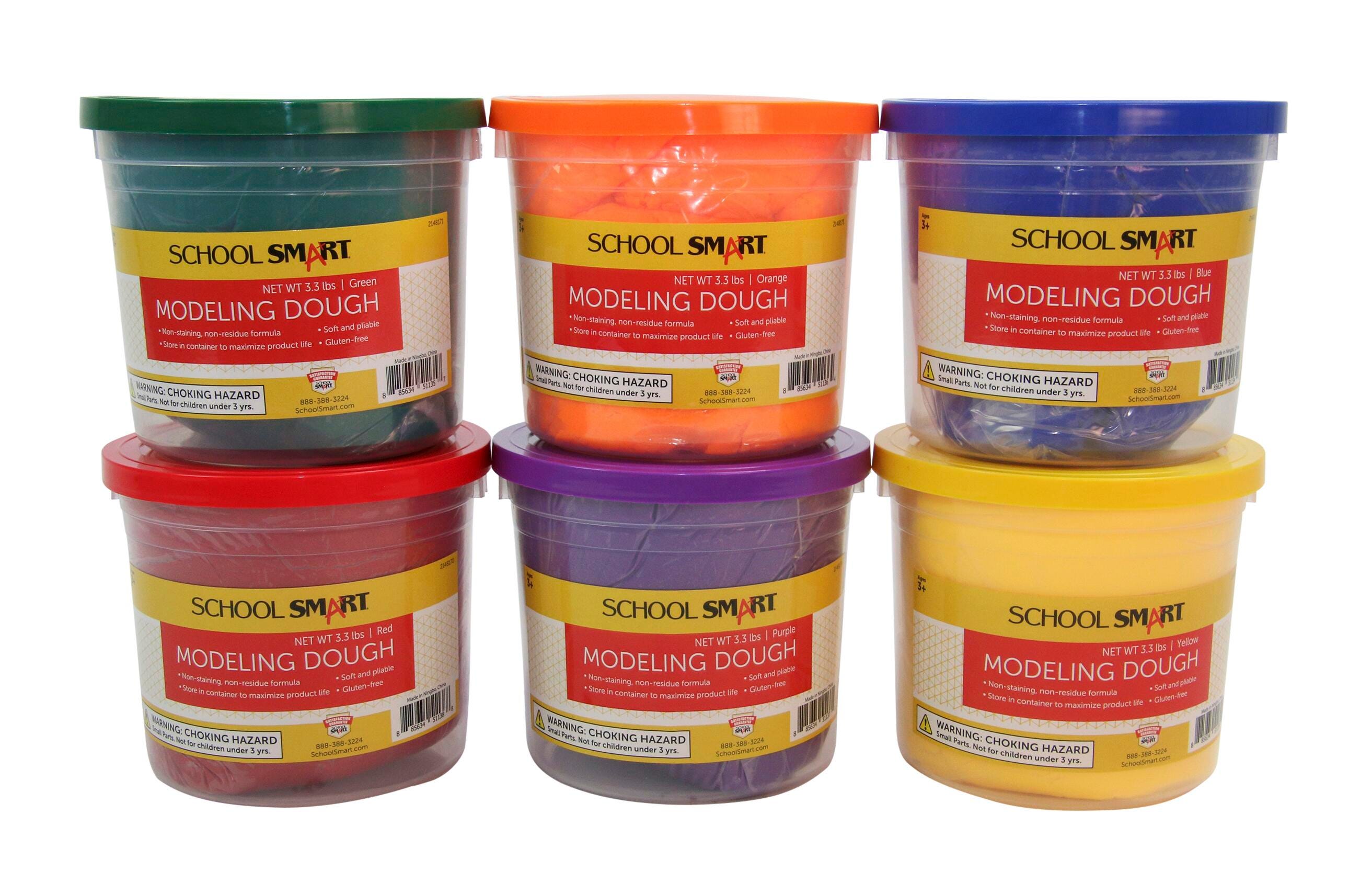This Modeling Dough by School Smart is soft, pliable, and ready to be molded into masterpieces! Young artists can take art into their own hands with this non-staining, non-toxic, gluten-free model-making material that's perfect for the classroom. The dough is easily reusable if returned to its plastic tub, or it can be air-dried to a workable hardness. Conforms to ASTM D-4236. This set of 6 includes one 3-1/3 pound tub for each of the following colors: red, orange, yellow, green, blue, and purple.Features