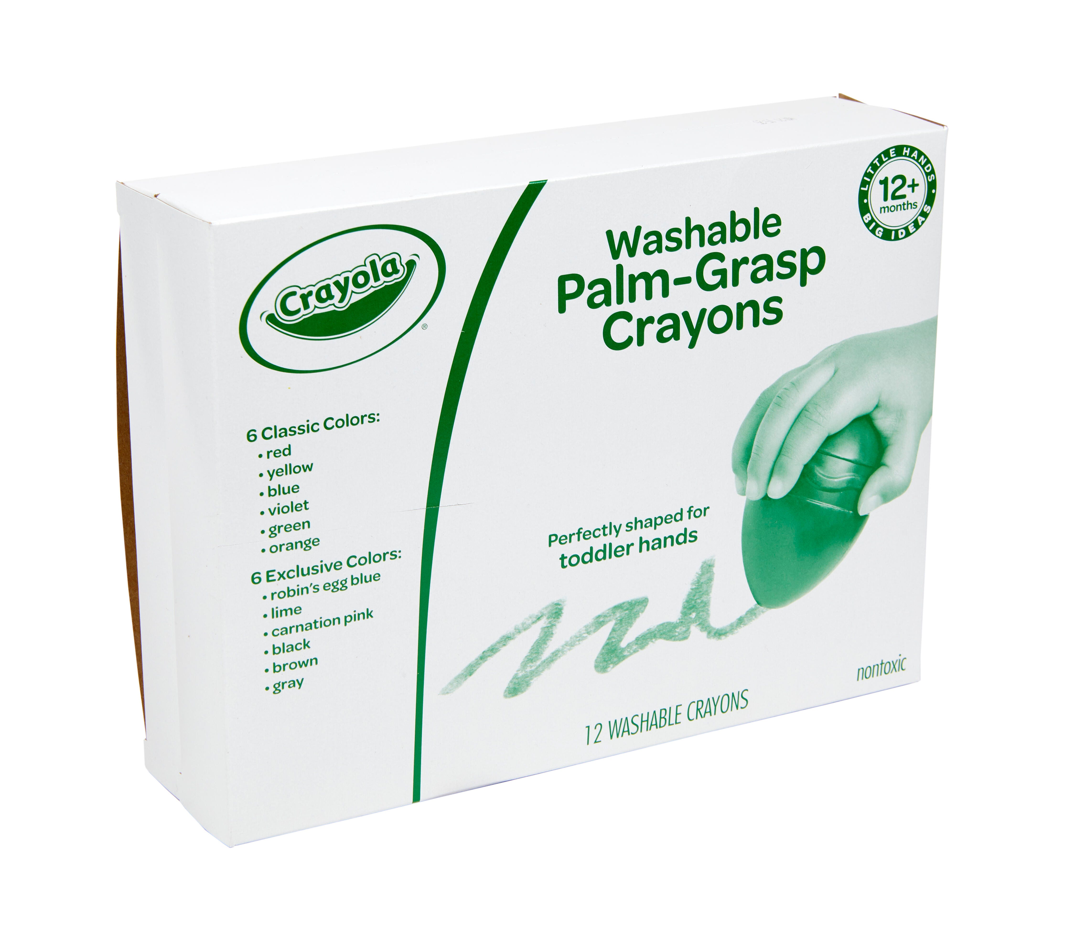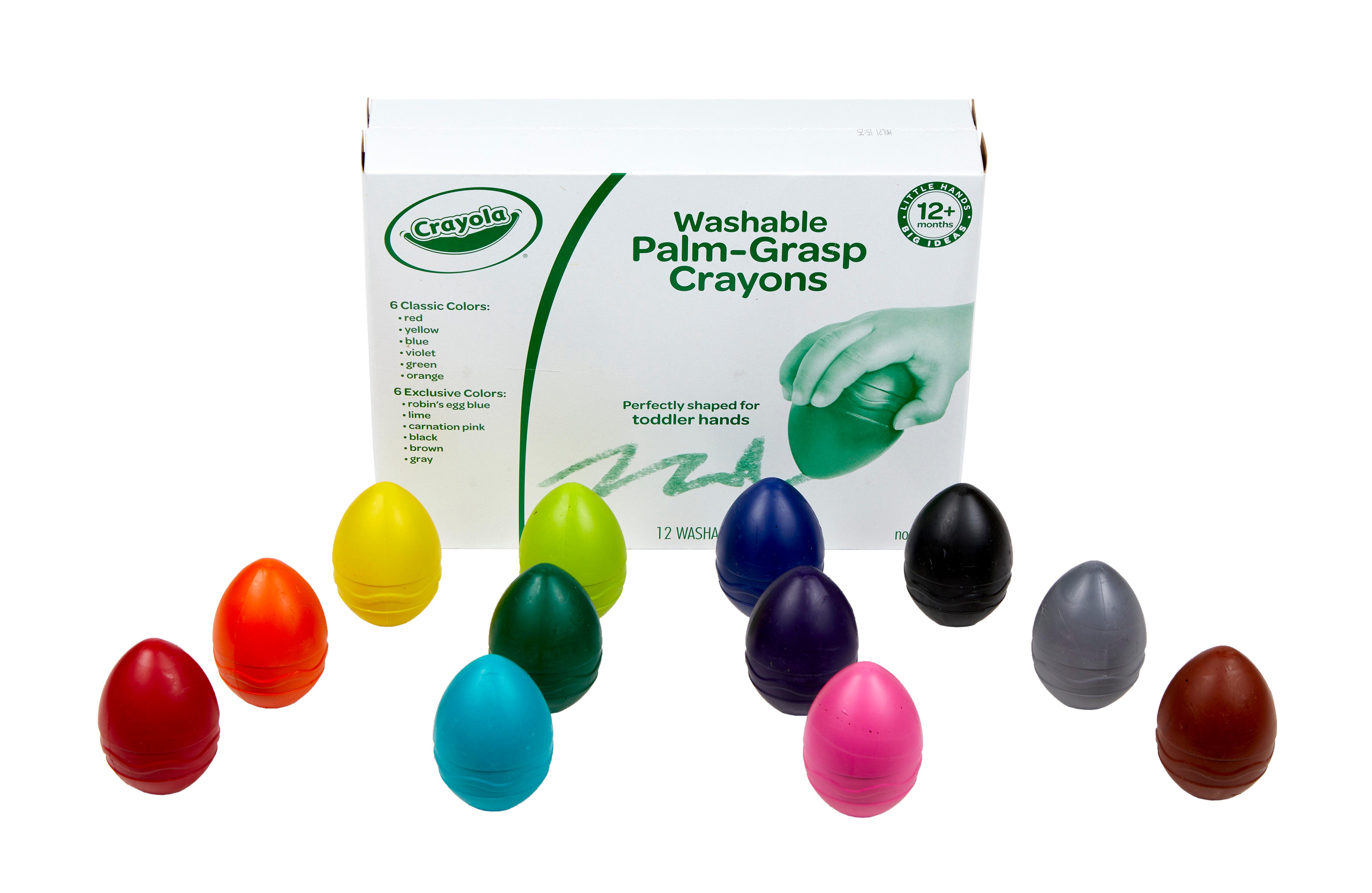 Encourage colorful creativity for the youngest artists with the Washable Palm-Grasp Crayons from Crayola. They feature a unique egg shape designed to fit comfortably into toddlers' small hands. Plus, they’re washable from skin, clothing, and most household surfaces for easy cleanup in any setting! Great for ages 1 and up. This set of 12 contains the following colors: red, yellow, blue, violet, green, orange, robin's egg blue, lime, carnation pink, black, brown, and gray.