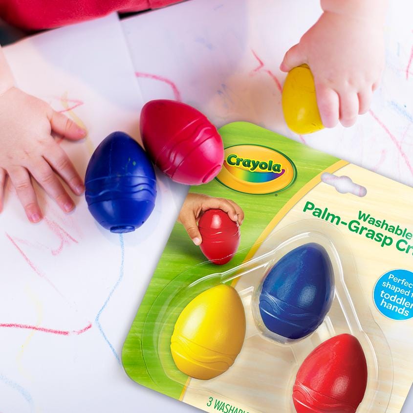 Encourage colorful creativity for the youngest artists with the Palm Grasp Washable Crayons from Crayola. They feature a unique egg shape designed to fit comfortably into toddlers' small hands. Plus, they’re washable from skin, clothing, and most household surfaces for easy cleanup in any setting! Great for ages 1 and up. This set contains 3 crayons: 1 yellow, 1 blue, and 1 red.