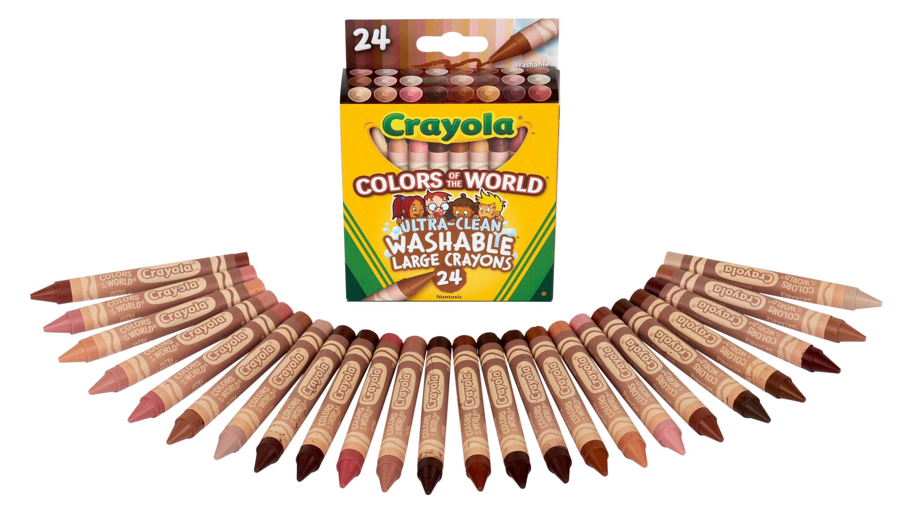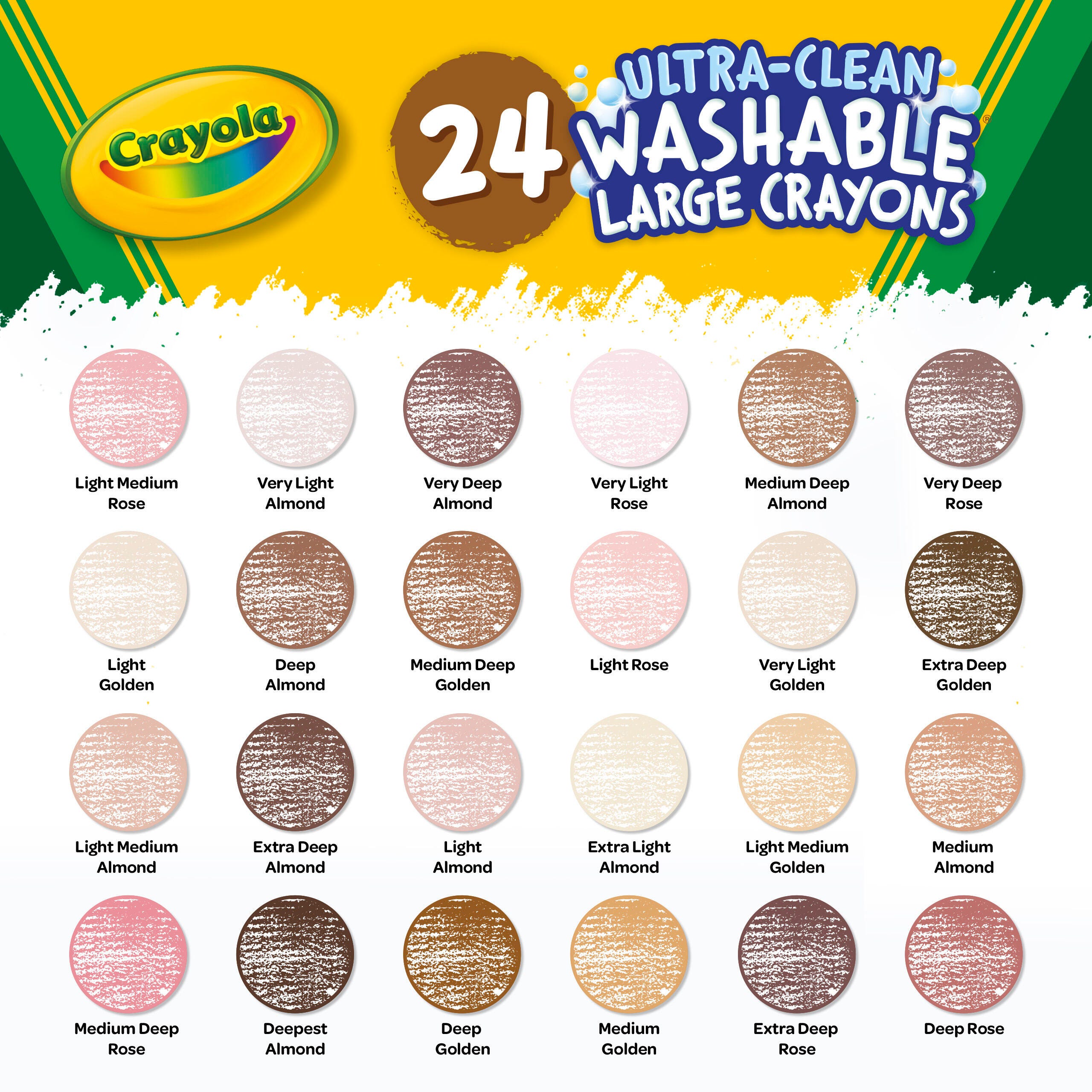 This set of Crayola Large Colors of the World Ultra-Clean Washable Crayons delivers realistic color and easy cleanup. Crayola Large Crayons are specially designed to be more comfortable for small hands and provide hours of creative fun. These crayons also feature a handy washable formula so they easily wash clean from skin, clothing, and even painted walls. These high-quality skin-tone crayons make a great addition to your arts and crafts supplies, making coloring pages or drawings even more detailed and realistic. The subtle shades inside are designed to better depict the growing diversity worldwide and fall into three main shades: Almond, Golden, and Rose – and all the darker or lighter shades in between. This set contains 24 crayons in an assortment of skin-tone colors.