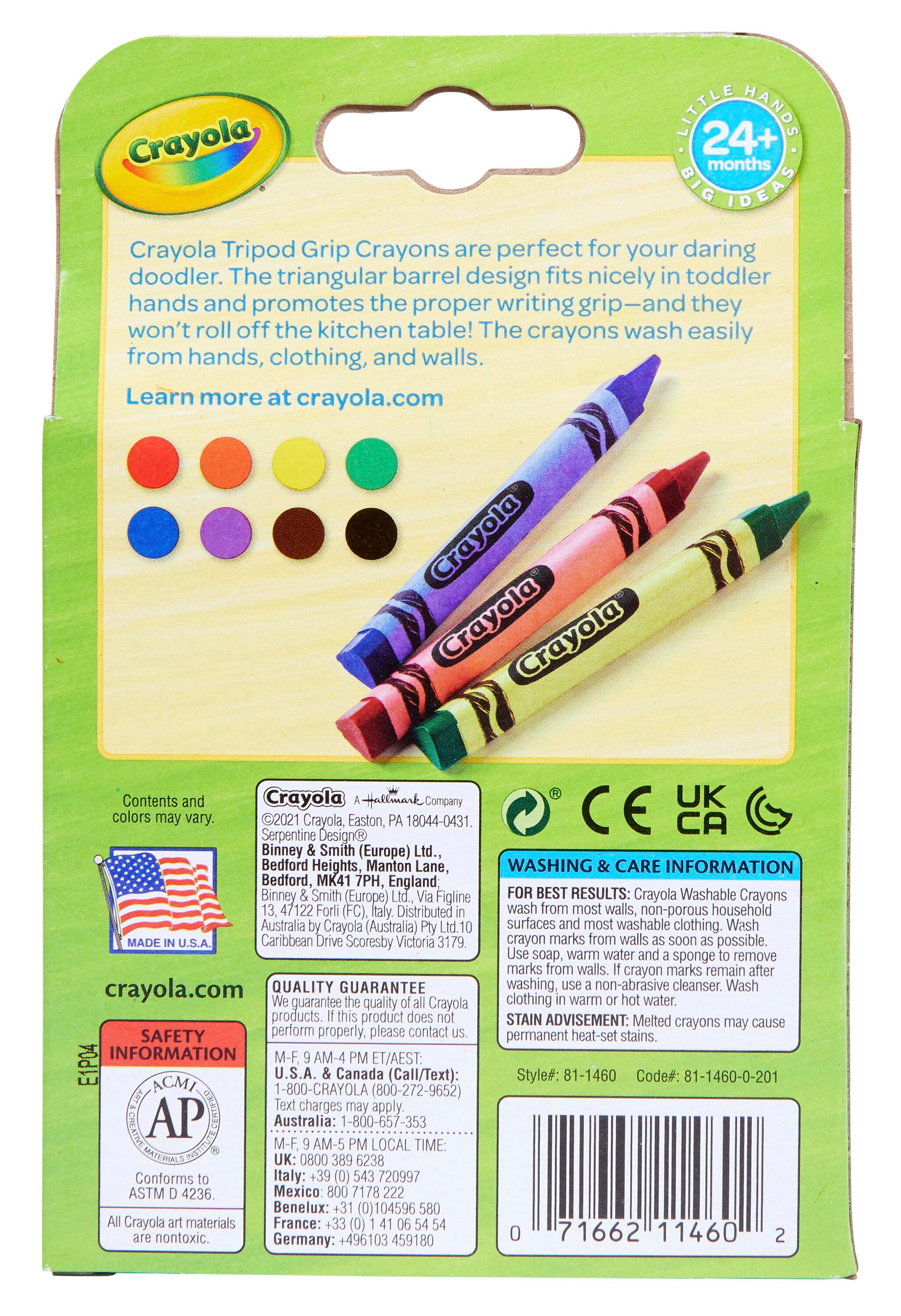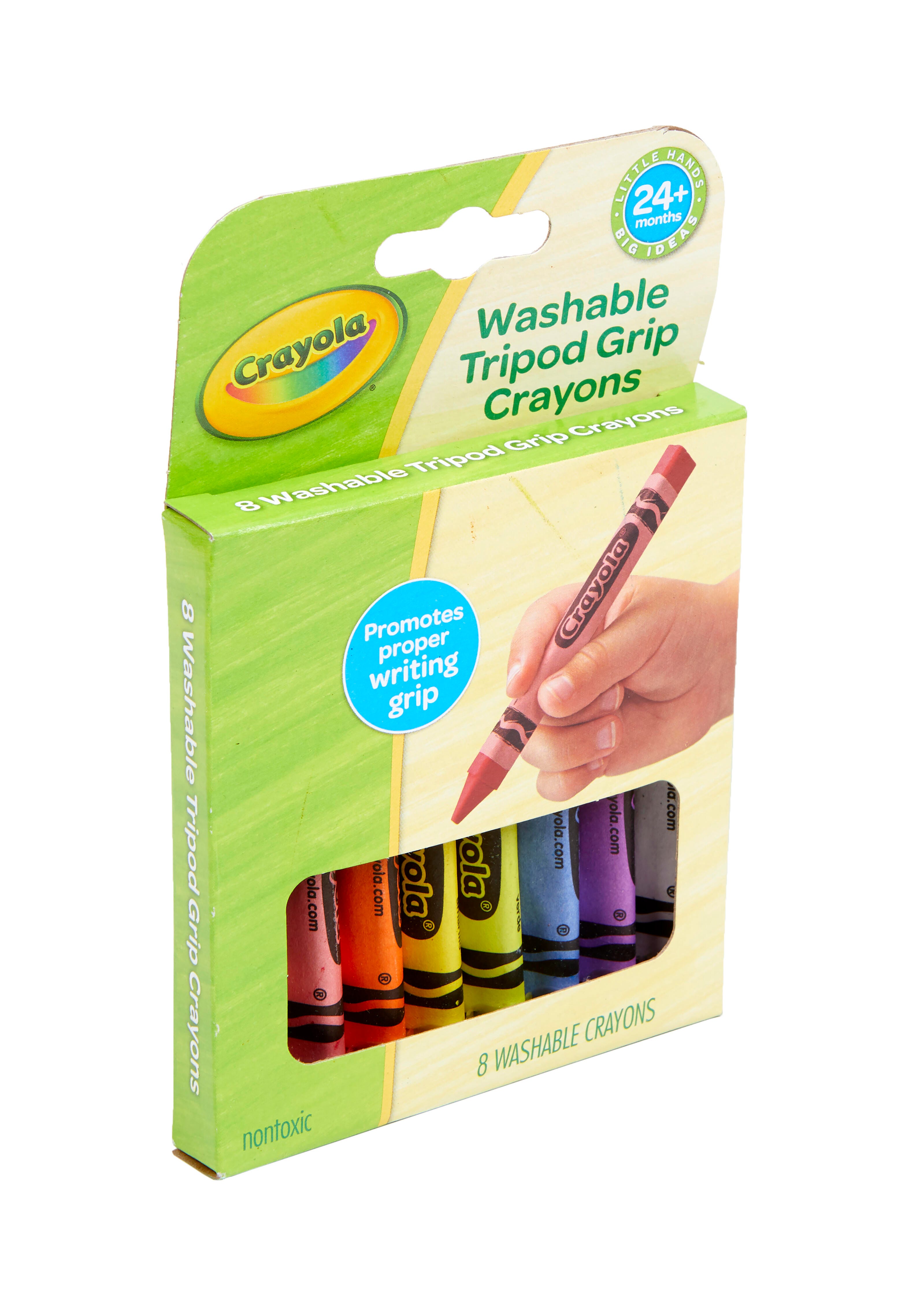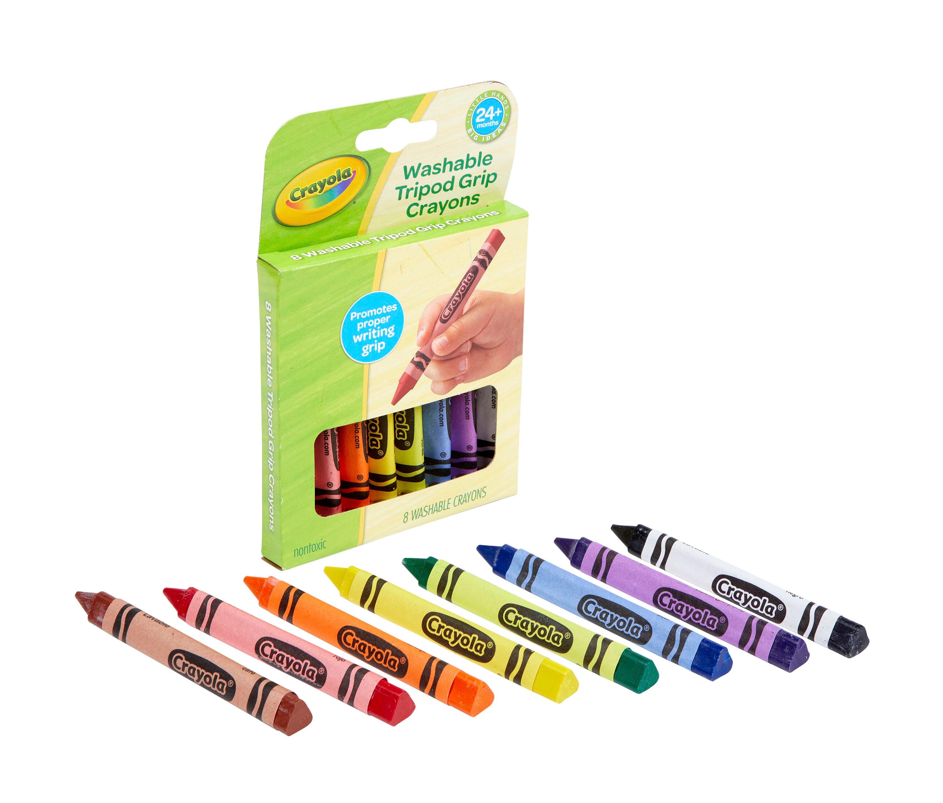 The Washable Tripod Grip Crayons from Crayola feature a triangular design that is easy for young artists to hold, and help develop the proper writing grip. The handy triangular shape also prevents the crayons from rolling away and getting lost. Plus, the child-friendly crayons are formulated for easy cleanup. This set contains 8 triangular crayons, 1 each of the following colors: red, orange, yellow, green, blue, purple, brown, and black.