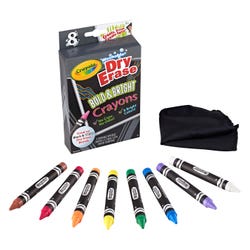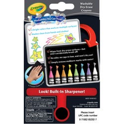 These Bold & Bright Washable Dry-Erase Crayons from Crayola offer a fun and unique art tool that is easy to clean! Perfect for whiteboards and other dry-erase surfaces, these crayons draw vibrant marks that easily wipe away with a dry cloth. This set includes the handy E-Z Erase Mitt, a built-in sharpener on the back of the box, and 8 dry-erase odorless crayons. The set contains one crayon in each of the following colors: brown, red, orange, yellow, green, blue, purple, and white.Features