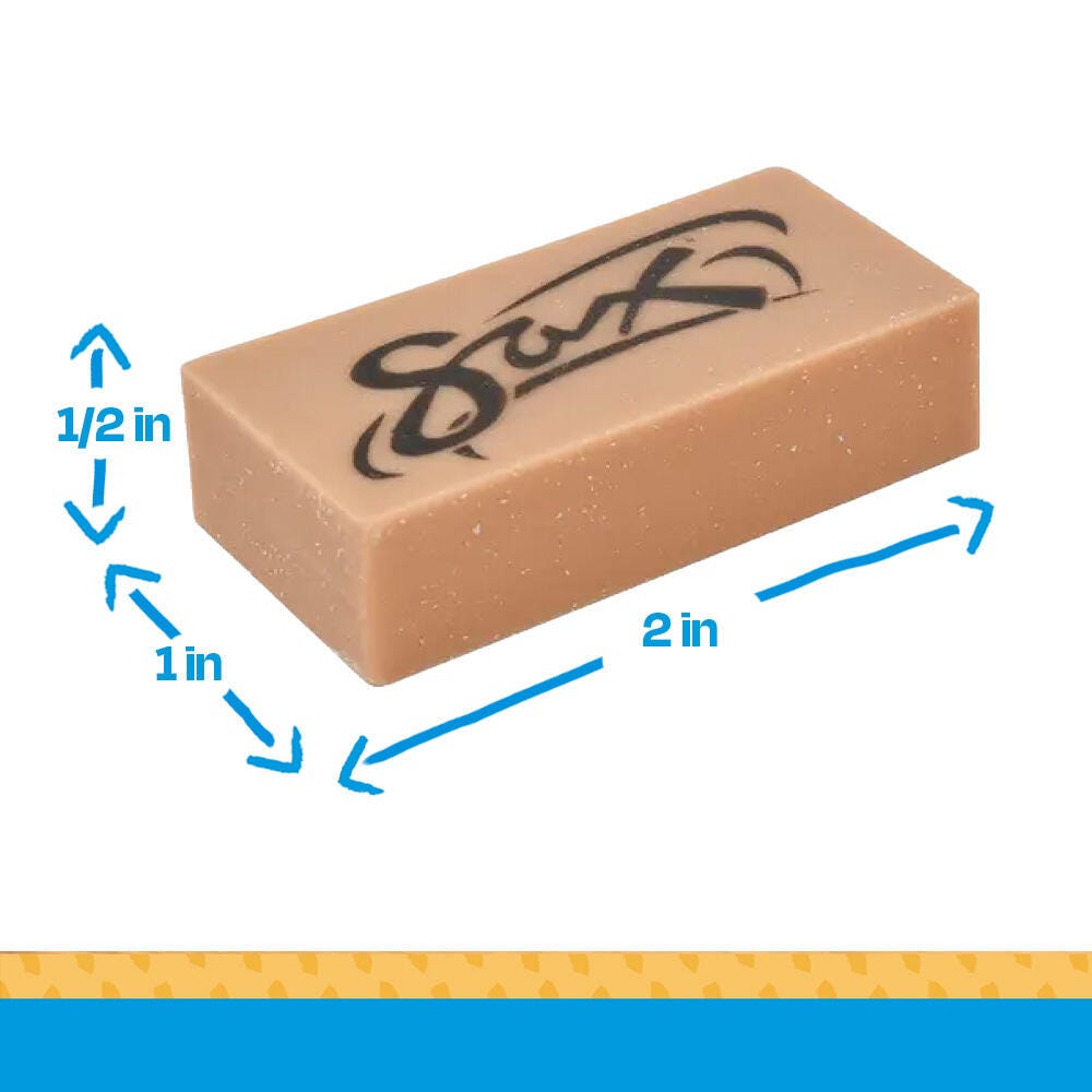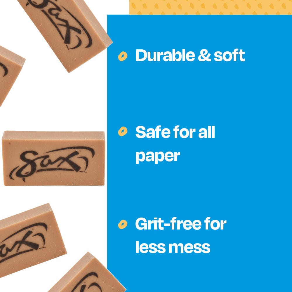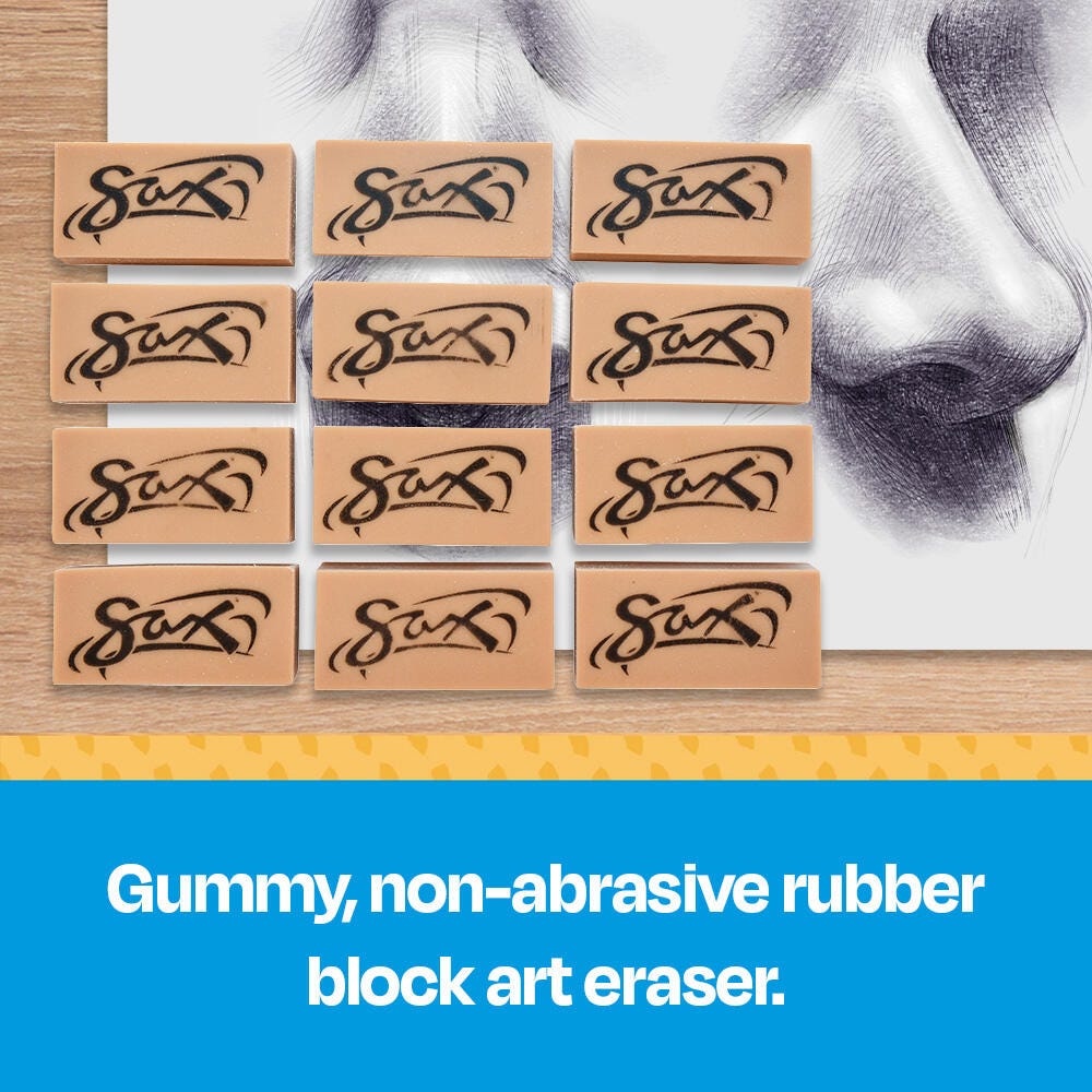 Sax art gum erasers help clean up projects without harming delicate work or paper surfaces. The soft, gummy texture is non-hardening, grit free, and non-abrasive. It removes surface dirt without smearing to protect sheets while cleaning. These eraser blocks crumble more easily to collect graphite and produce less damage than traditional erasers. Turn to the soft, gummy texture to help protect your best projects. The erasers work on both traditional pencil marks and colored pencil marks, and are an excellent choice for erasing charcoal media, scuffed walls, stains or marks from books, and beyond.
