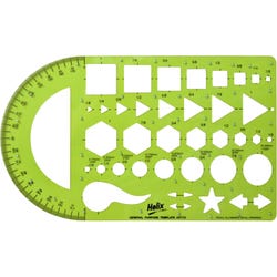 The Helix General Purpose drafting template features 41 total shapes including equilateral triangles, hexagons, squares, circles, arrows, a star and a 180 degree protractor. Includes ink risers on reverse side to prevent smudging. Designed with a 0.5 mm pencil allowance. Made from dimensionally stable transparent shatter resistant plastic. Measures 5-1/2 x 9-1/2 inches.
