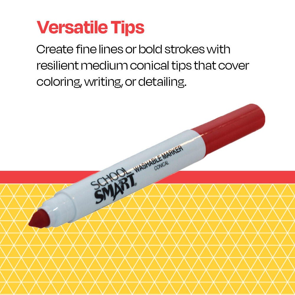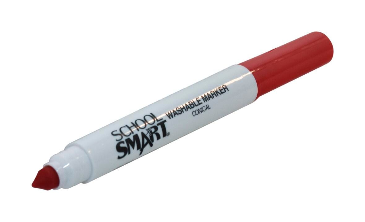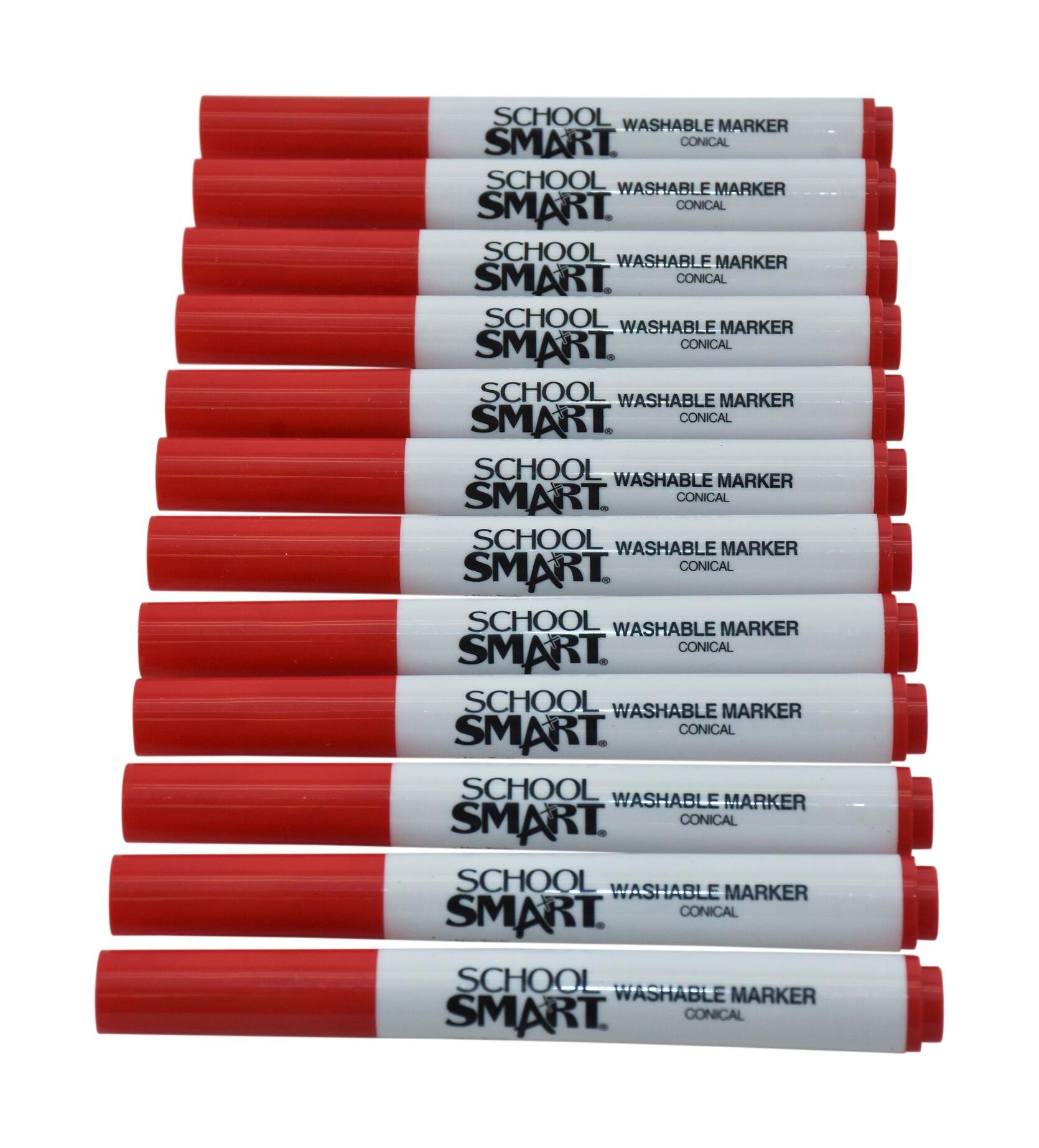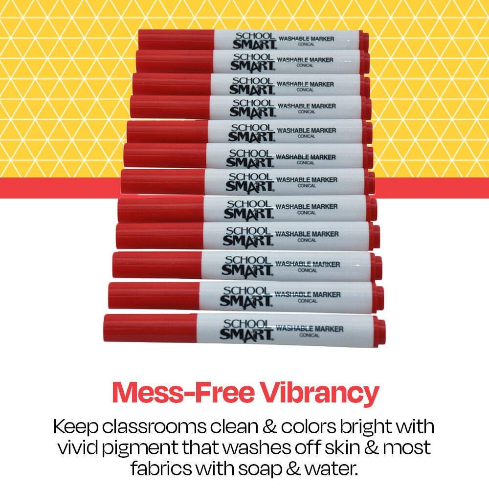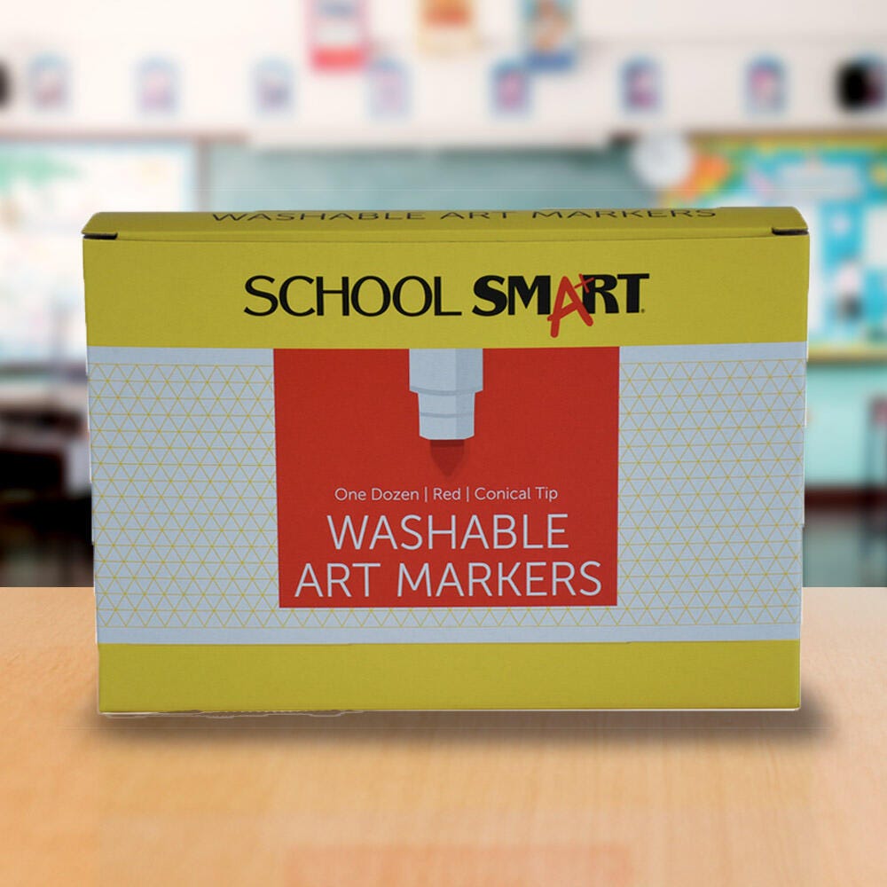 School Smart Art Markers take art to an effortless level with a vivid red color and durable conical shaped nibs. They are designed for making smudge-resistant medium lines, broad strokes, or allover thorough coverage. Glides smoothly across any type of paper. Tips hold up to active daily use without wearing down. Great for young classrooms, as formula comes off hands and most fabrics with soapy water. Non-toxic.
