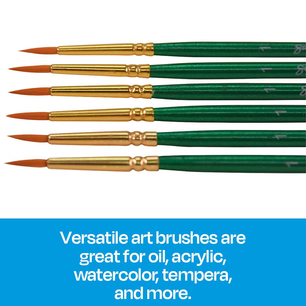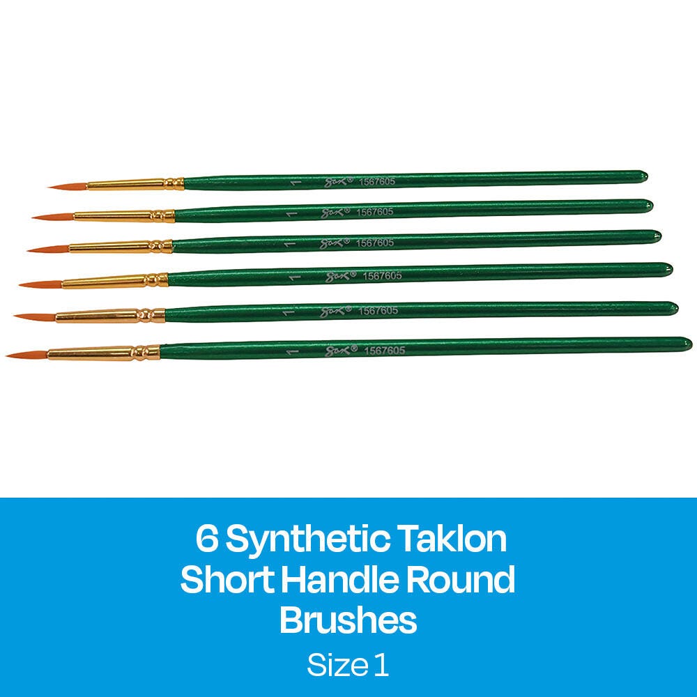 Sax golden taklon paint brushes with short handles and a round tip provide optimum snap and smooth application. Excellent brush strokes help students create their best projects while enhancing their painting techniques on different mediums. Our 6-pack of synthetic bristle brushes is perfect for all your crafting needs in the classroom or art studio. Use the size 1 brushes for very fine detail and small spaces. Golden nylon synthetic hair brushes are great with different mediums, including oil, acrylic, and watercolors.