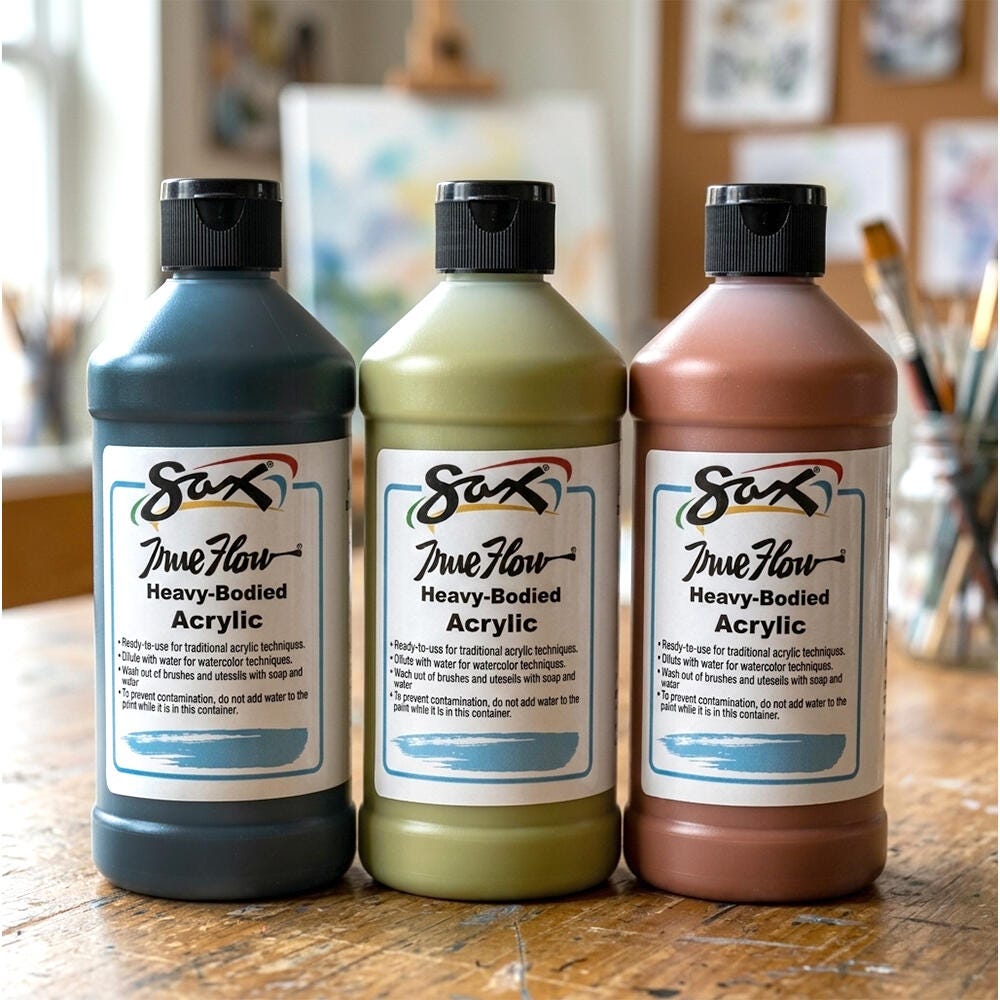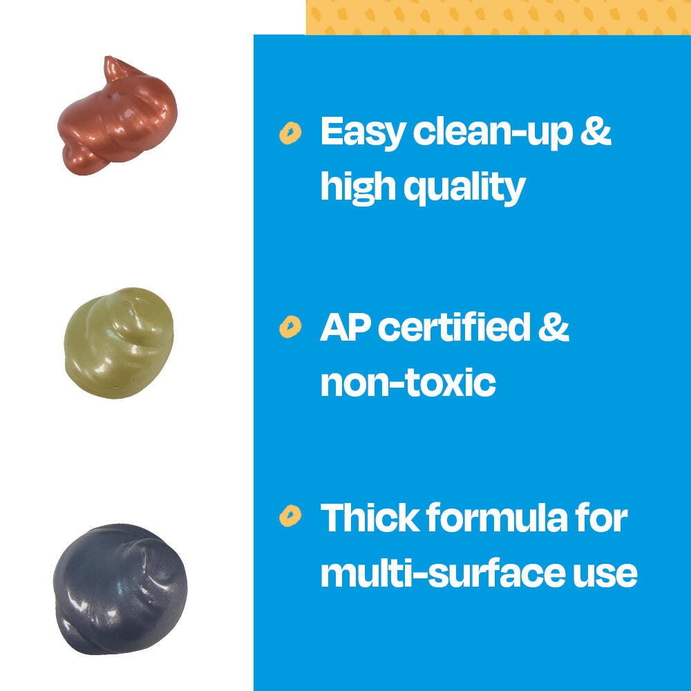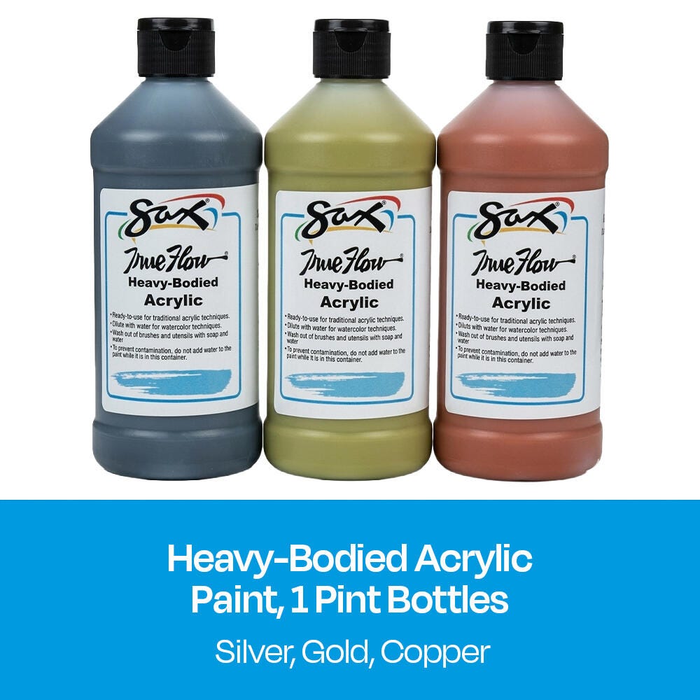 The Sax heavy-bodied acrylic paint kit comes in assorted metallic colors to create shimmering, striking posters and paintings. Complete unique projects with 3 different color options. This metal-like paint provides smooth, consistent color and texture in a heavy body for endless art activities. Our painting medium dries to a matte finish and works with traditional acrylic painting, block printing, and/or silk screening. It’s also great for layering and intermixing with Sax paints from this series. Clean up is easy with soap and water, and each paint comes in easy-to-grip jugs with reliable screw-on caps.