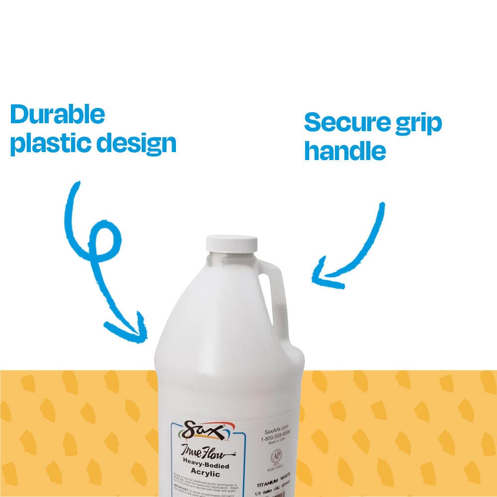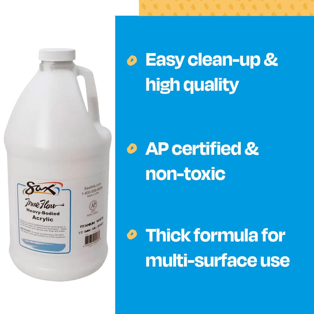 This Sax heavy body acrylic paint in a titanium white color comes in a convenient half gallon bottle to accommodate the whole classroom. Non-separating and intermixable for a range of hues, our art paint is easy to apply. This paint dries to a matte finish and is ideal for traditional acrylic painting as well as block printing or silk screening. Enjoy excellent flow, coverage, blending, and drying for a variety of projects. Use the classroom paint for school assignments, art classes, group painting, or background canvas painting. Each acrylic paint comes in a durable plastic container for convenient handling and storage. Not recommended for outdoor use.