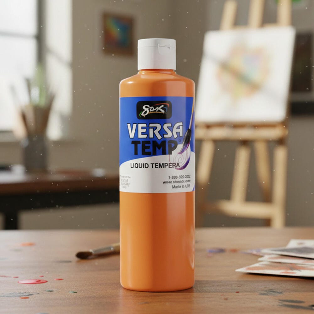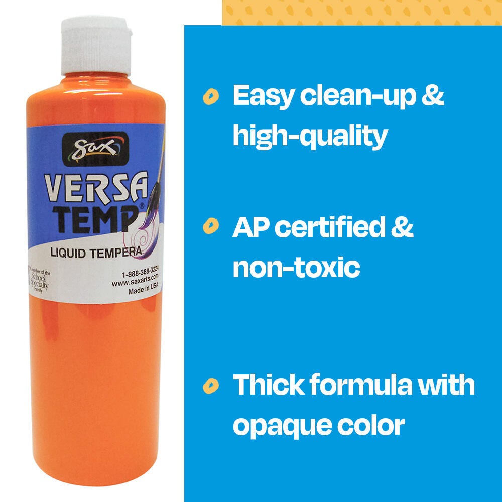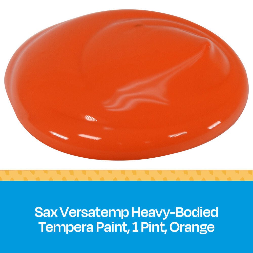 Sax Versatemp heavy-bodied tempera paint in orange produces bold, vibrant results. Foster creativity with a paint that resists cracking and chipping. The convenient pint bottle is easy to pour and store, and is perfect for sharing in the classroom. Complete art projects, posters, and signs that stand out with one shade or craft new hues by mixing. The heavy formula is easy to apply and mix.