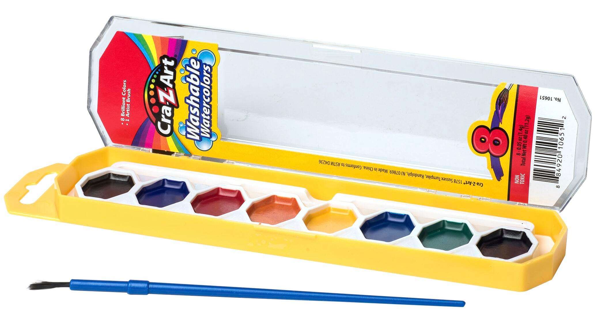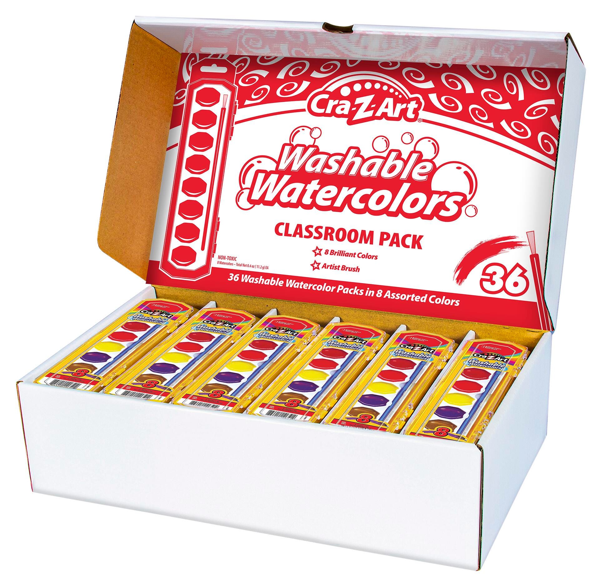 Bright watercolors with an included artist brush feature a washable colors to quickly wash off skin and most clothing with just a bit of soap and water. Nontoxic design is safe for use by young learners. Hard case keeps the colors and paint brush safely contained for quick and easy storage. Great for classrooms with 36-8ct. watercolors per classroom pack.