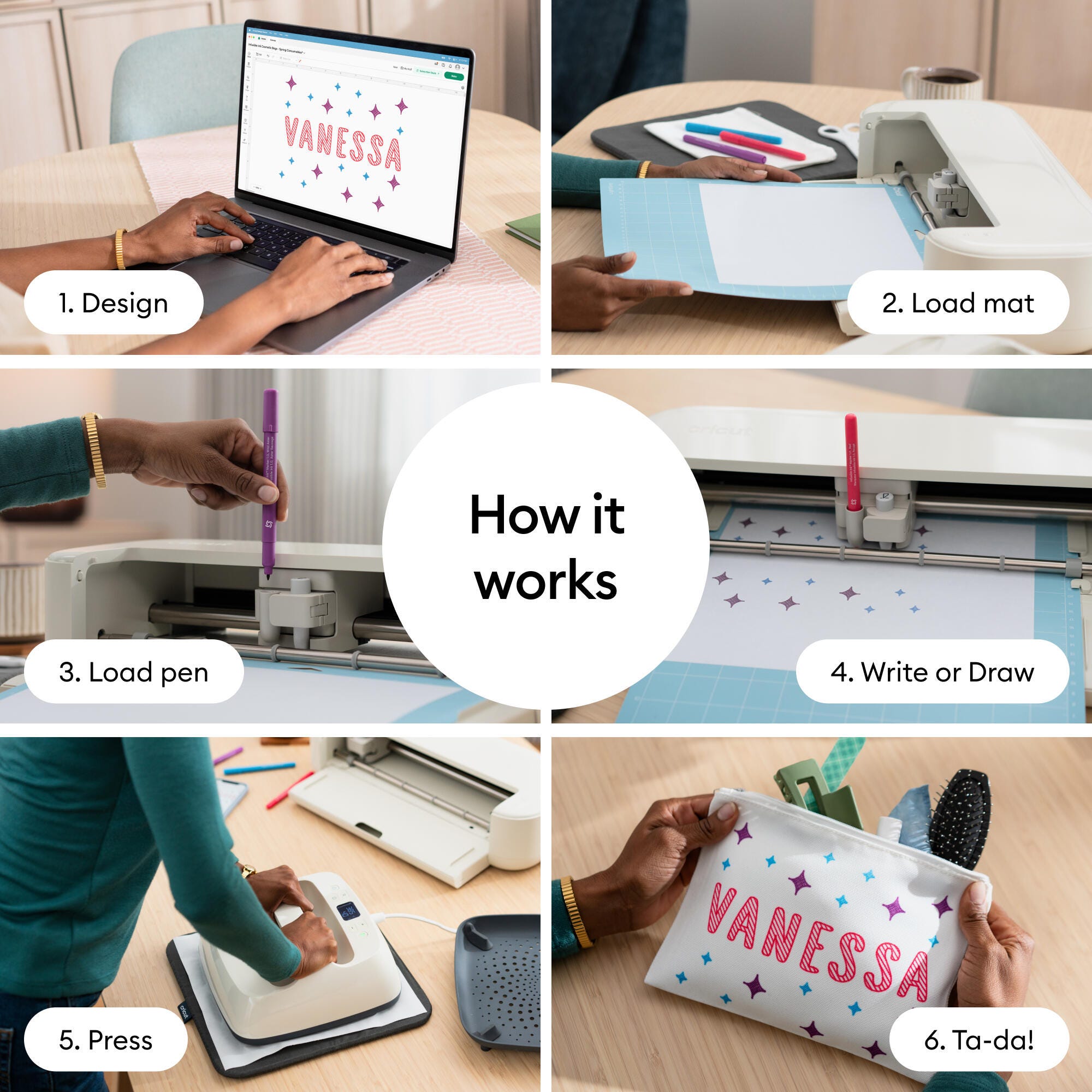 Apply heat and watch as your designs bloom into vibrant, permanent, pro-quality transfers on the Infusible Ink blank of your choice. Use these five vivid, medium point sublimation markers to draw designs using your Cricut smart cutting machine on plain laser copy paper, or freehand your designs for a personal touch. What is the Infusible Ink process? Unlike an iron-on transfer or vinyl application, where artwork is attached on top of a compatible material using adhesive, an Infusible Ink heat transfer becomes one with the material itself. How it works: 1. Draw design using Infusible Ink Pens or Markers on laser copy paper. 2. Choose a compatible Infusible Ink blank. 3. Transfer design with Cricut EasyPress, or heat press. The Infusible Ink system also includes Infusible Ink Transfer Sheets in a variety of solid colors and patterns. Plus, a growing list of compatible Infusible Ink blanks, including T-shirts, tote bags, pillow cases, wine bags, cosmetic bags, and coasters.