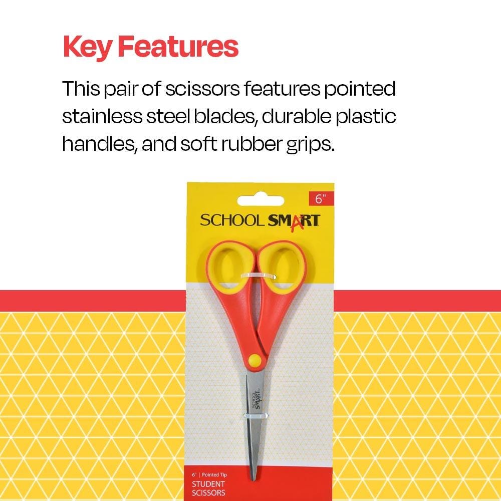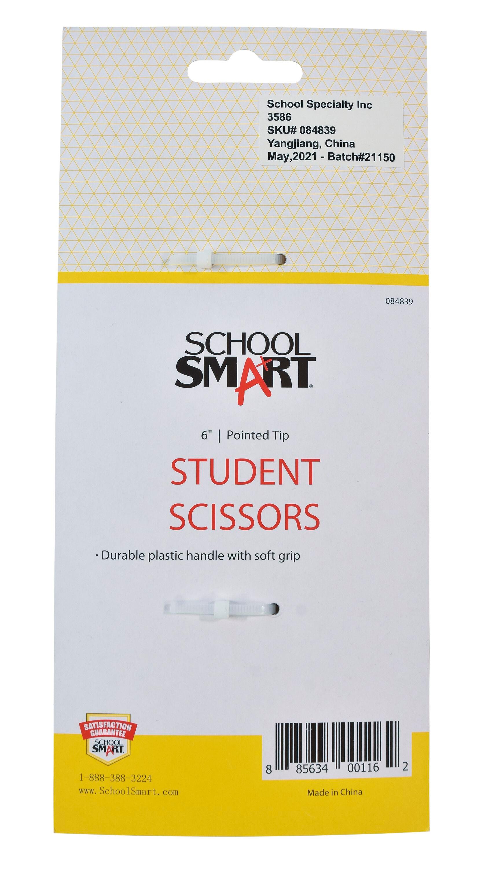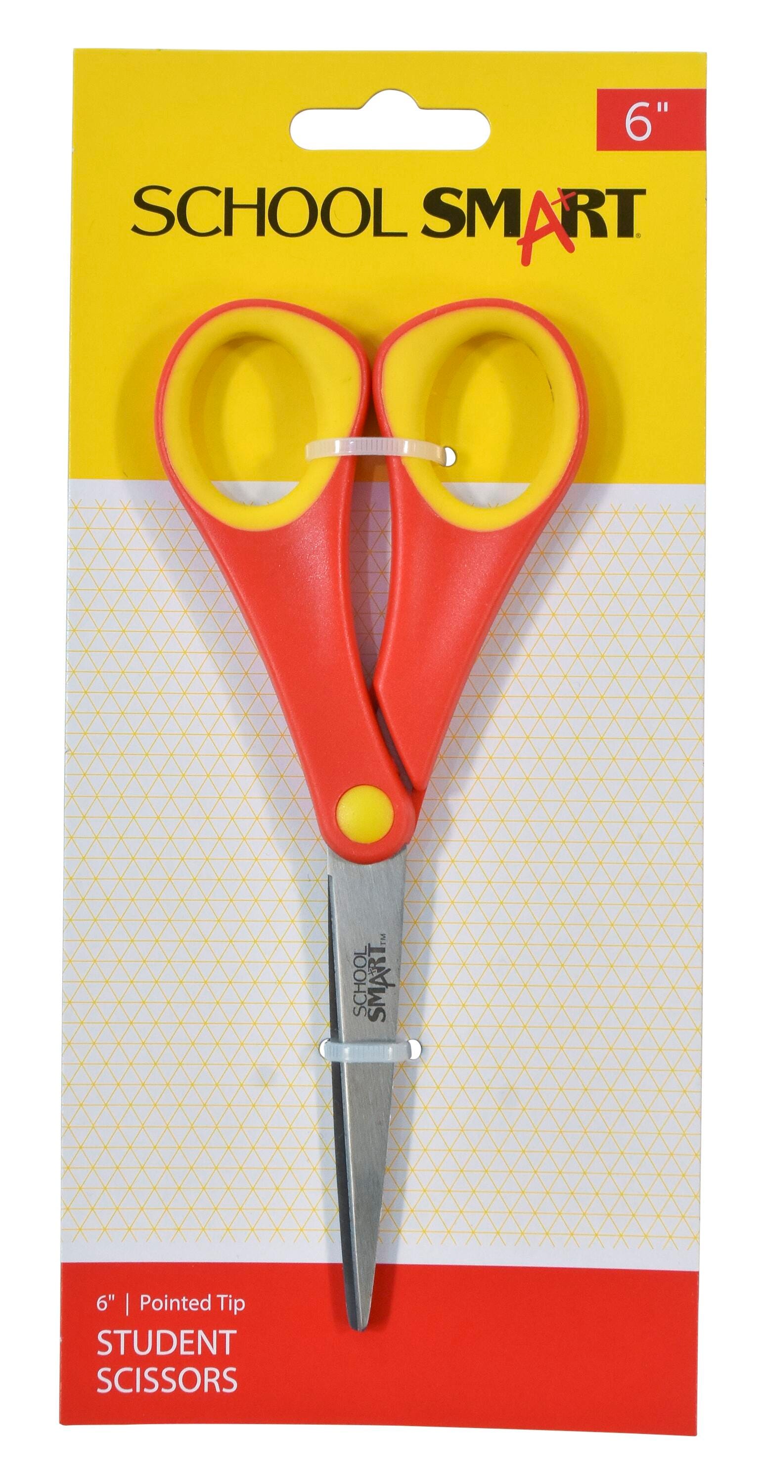 Discover School Smart pointed tip student scissors at an affordable price. Our high-quality children's scissors are perfect for classrooms and recreation centers. The stainless steel blades and durable plastic handles are made for slightly larger hands so students can comfortably cut. Appropriate for elementary and middle school, the pointed tip scissor is for ages 8+ and works for right or left hands.