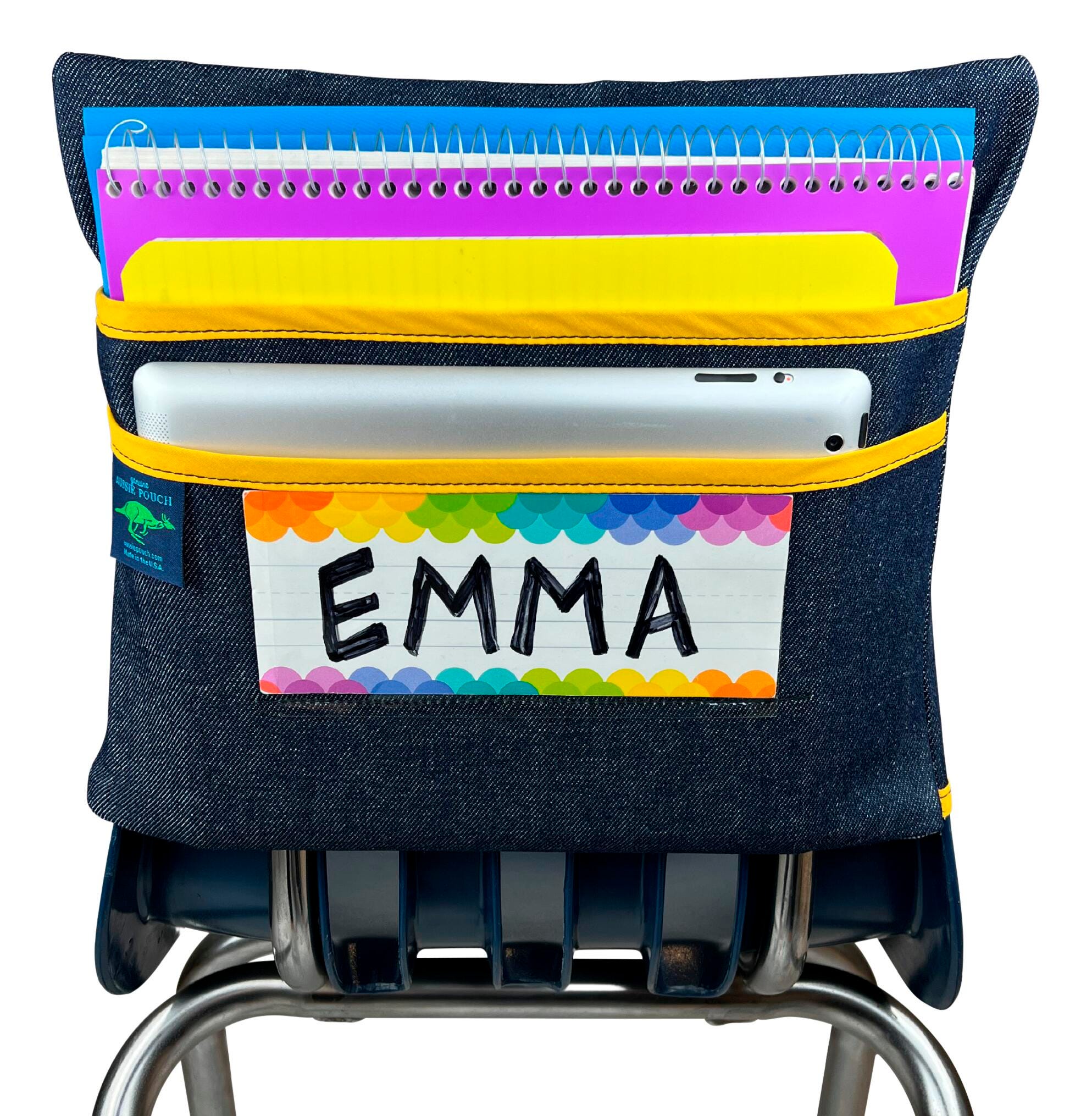 Say goodbye to overstuffed desk drawers and covered desktops! Aussie Pouch school chair pockets take the load off by neatly compiling classroom supplies right at the back of children’s seats. These premier quality pockets are manufactured with heavy weight denim that is machine washable and lasts up to 10 years! Two large pockets (with solid yellow trim) hold a variety of school supplies, notebooks, and beyond; an additional clear plastic slot can hold name tags or labels for easy identification. Large sized pouch pocket (at 17 inches) fits chairs with a backrest with top measuring 14 to 16 inches wide and a bottom measuring 14 to 16 inches wide. The denim wash of the Classic style also has a slightly blackish undertone (hues may have variations) to lend authentic style.Features