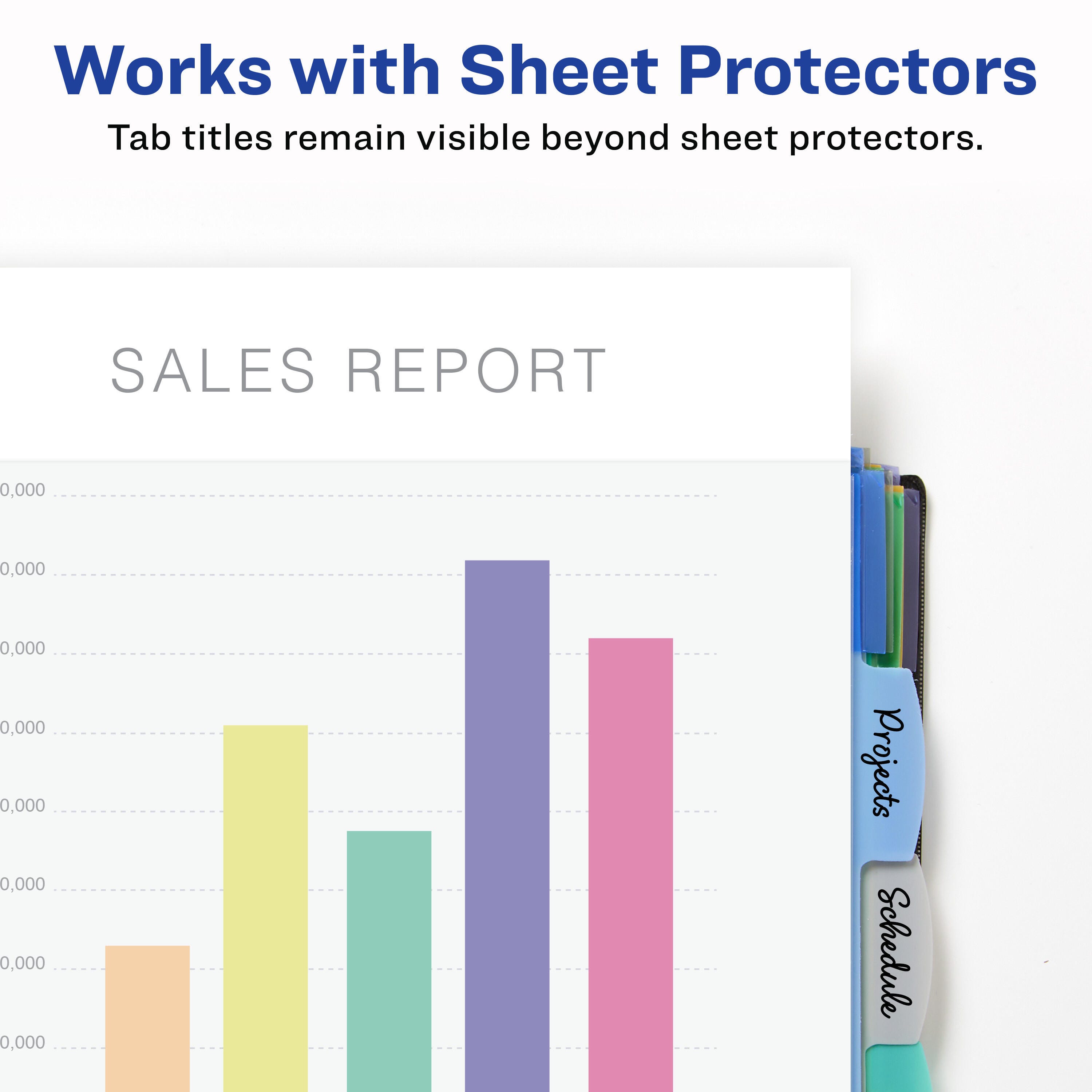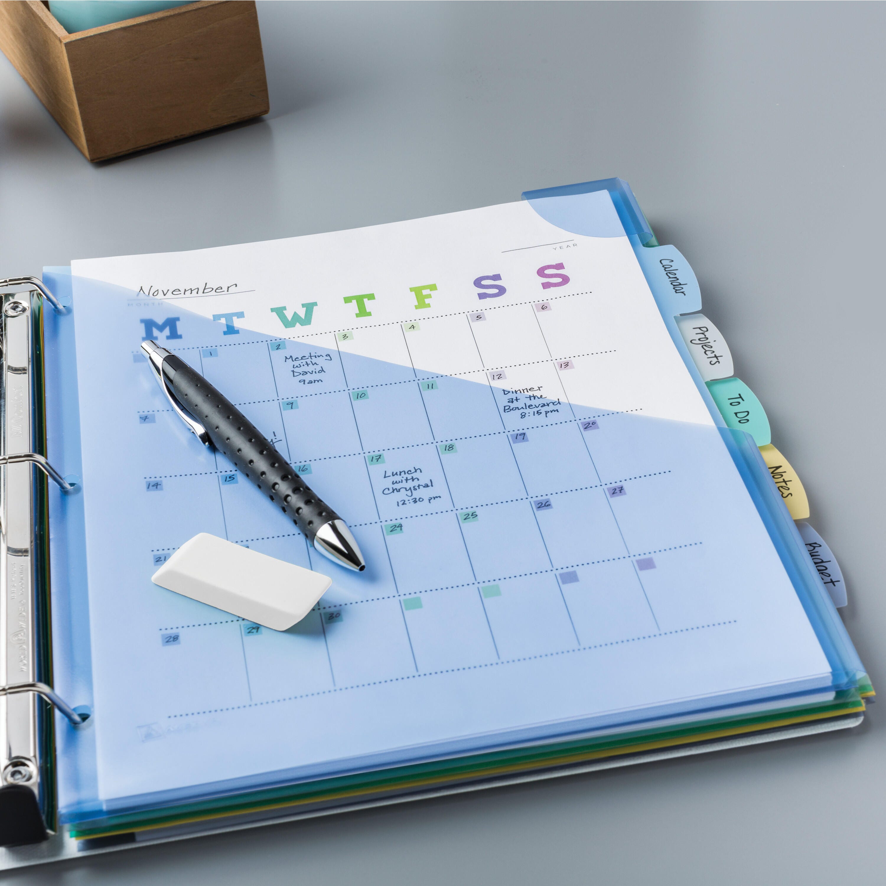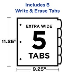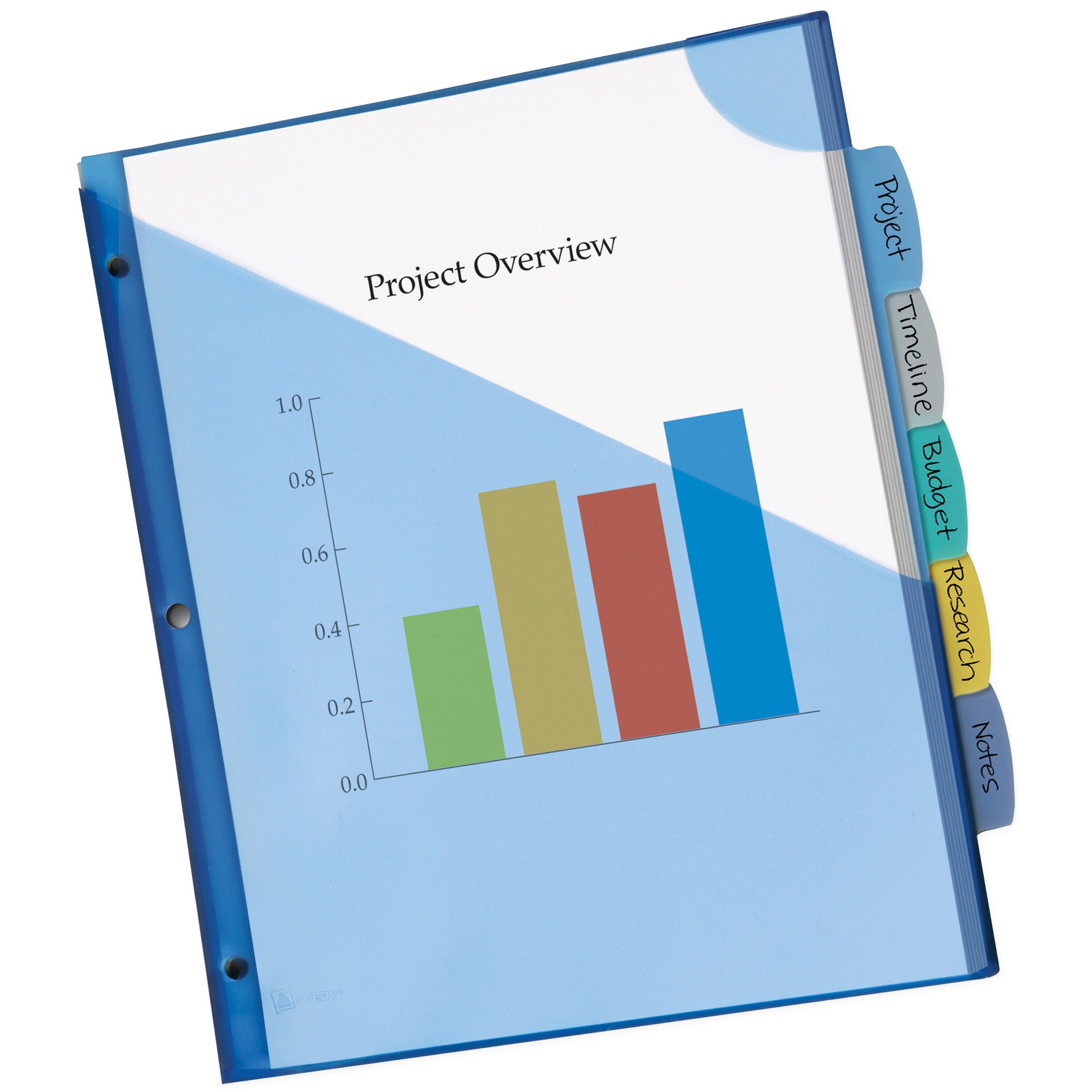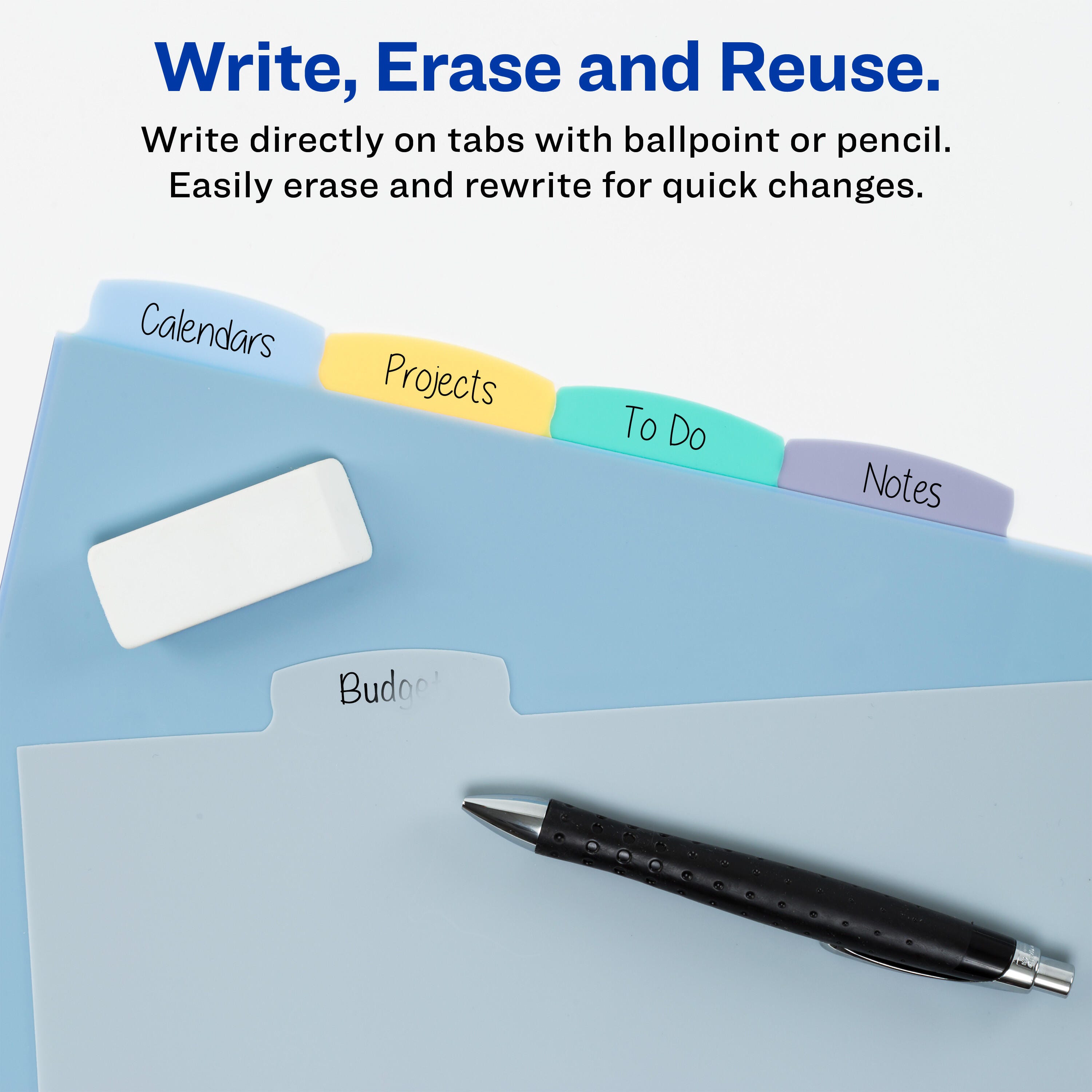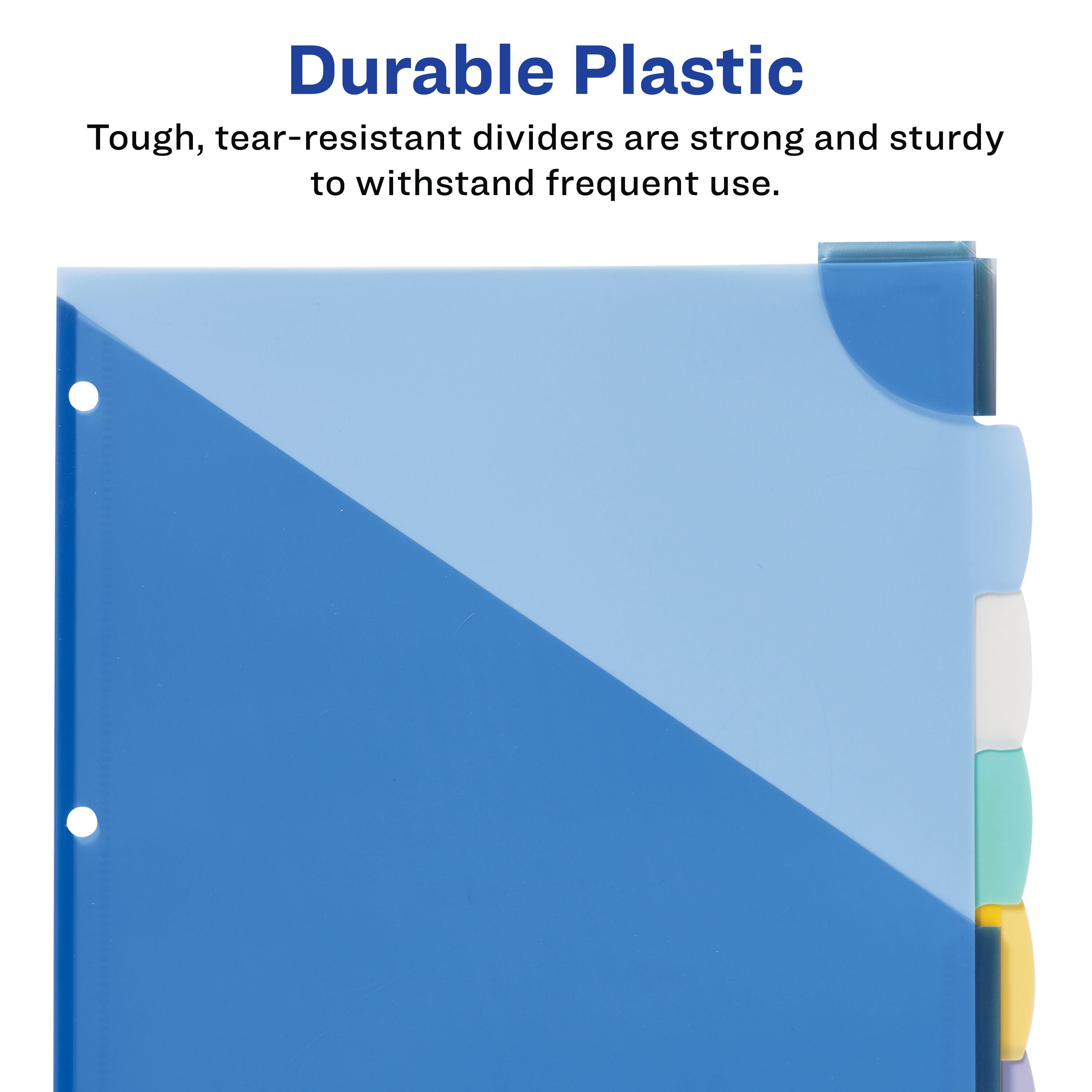 Make organizing easy and effective with these customizable multicolored dividers. The plastic dividers have large customizable tabs that provide ample space for labeling. Plus, the tabs can be written on with a pen or pencil and easily erased, so you can use the dividers again and again. Each divider has a handy storage pocket to keep loose sheets, and Avery’s signature Corner Lock™ Technology ensures your important documents stay put. These plastic dividers are 3-hole punched and wide enough to display your custom tabs over the edge of a binder for easy viewing. This pack contains 5 dividers in an assortment of colors for neat organization in the classroom, office, or home.Features