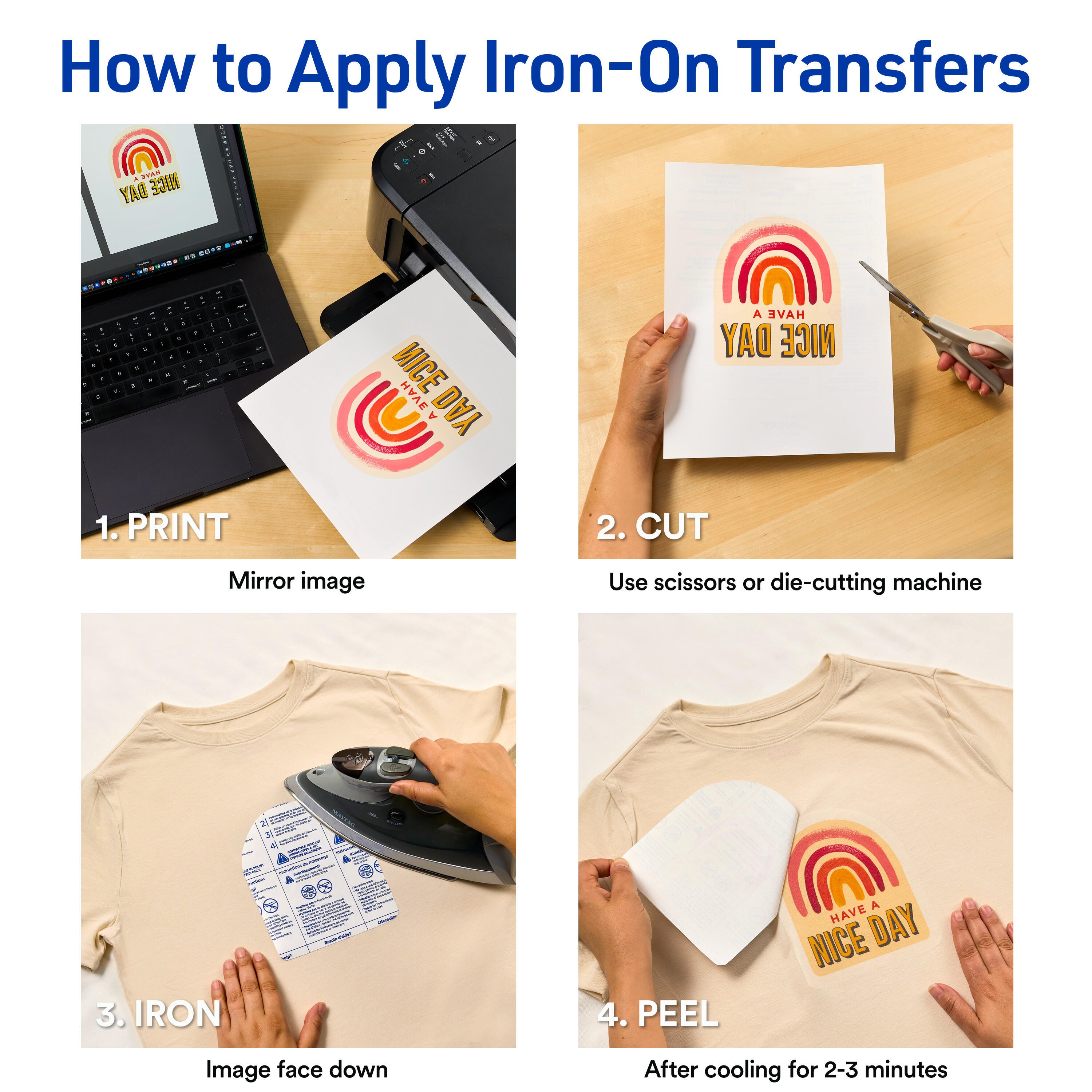 • Unprinted iron-on transfer sheets feed easily through most inkjet printers