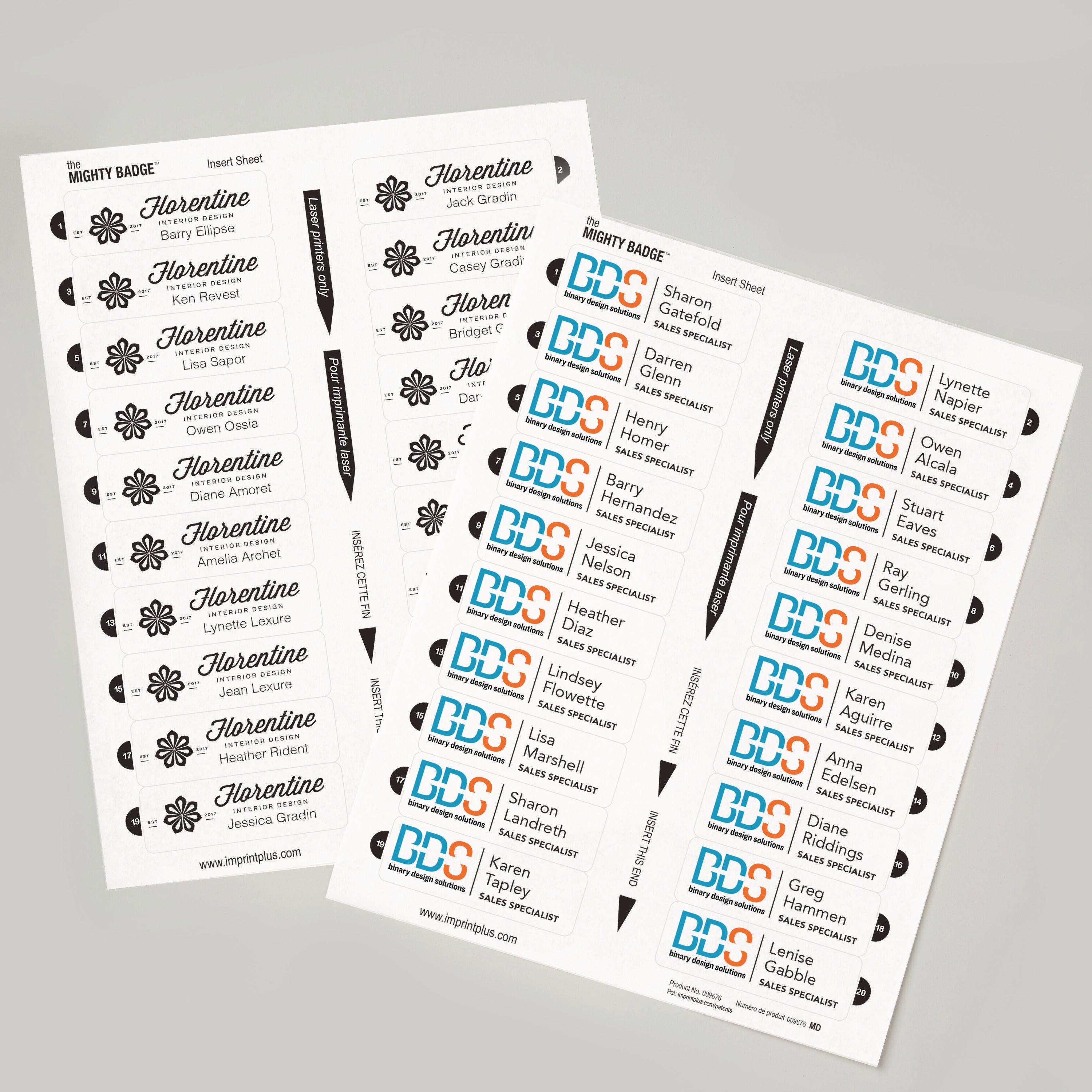 Create custom name badges or visitor passes in just minutes with the Mighty Badge® by Avery® Professional Reusable Name Badge System. The included insert sheets can be fed through the printer multiple times, so you can print individual badges or the entire sheet at once. Each 1 x 3 inch personalized name badge is easy to assemble with easy-to-peel inserts. The all-in-one badge kit includes 10 silver-tone steel plates, 10 durable magnetic fasteners, 10 crystal-clear, shatter-resistant lens covers, and printable insert sheets to create 40 clear inserts and 40 white inserts.Features