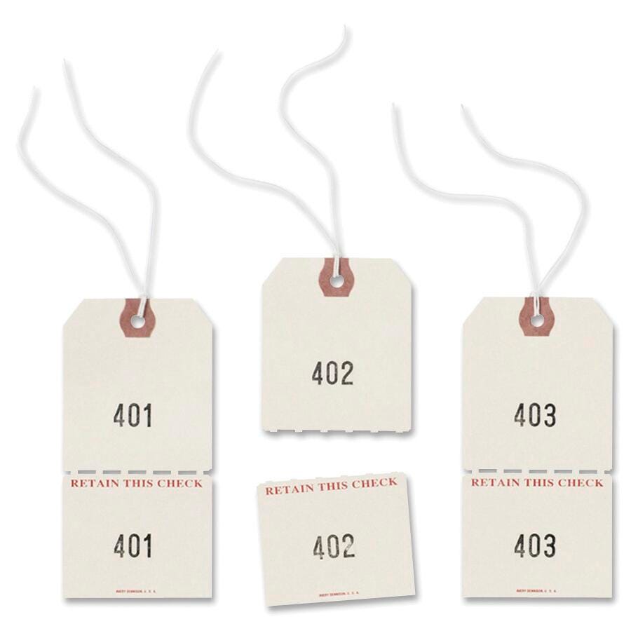 From coats to keys, Duplicate Auto Park Tags make sure nothing gets lost in the shuffle. They feature a reinforced patch and strong twine that affixes quickly and reliably so important items such as keys are securely labeled and quickly stored. Tags are conveniently banded in packs of 100, and sequentially numbered 1 to 500 in duplicate on the top and bottom coupon for easy identification. Bottom customer portion is printed with "retain this check" as a friendly reminder in highly visible red. Customers and guests are in and out with their belongings in no time