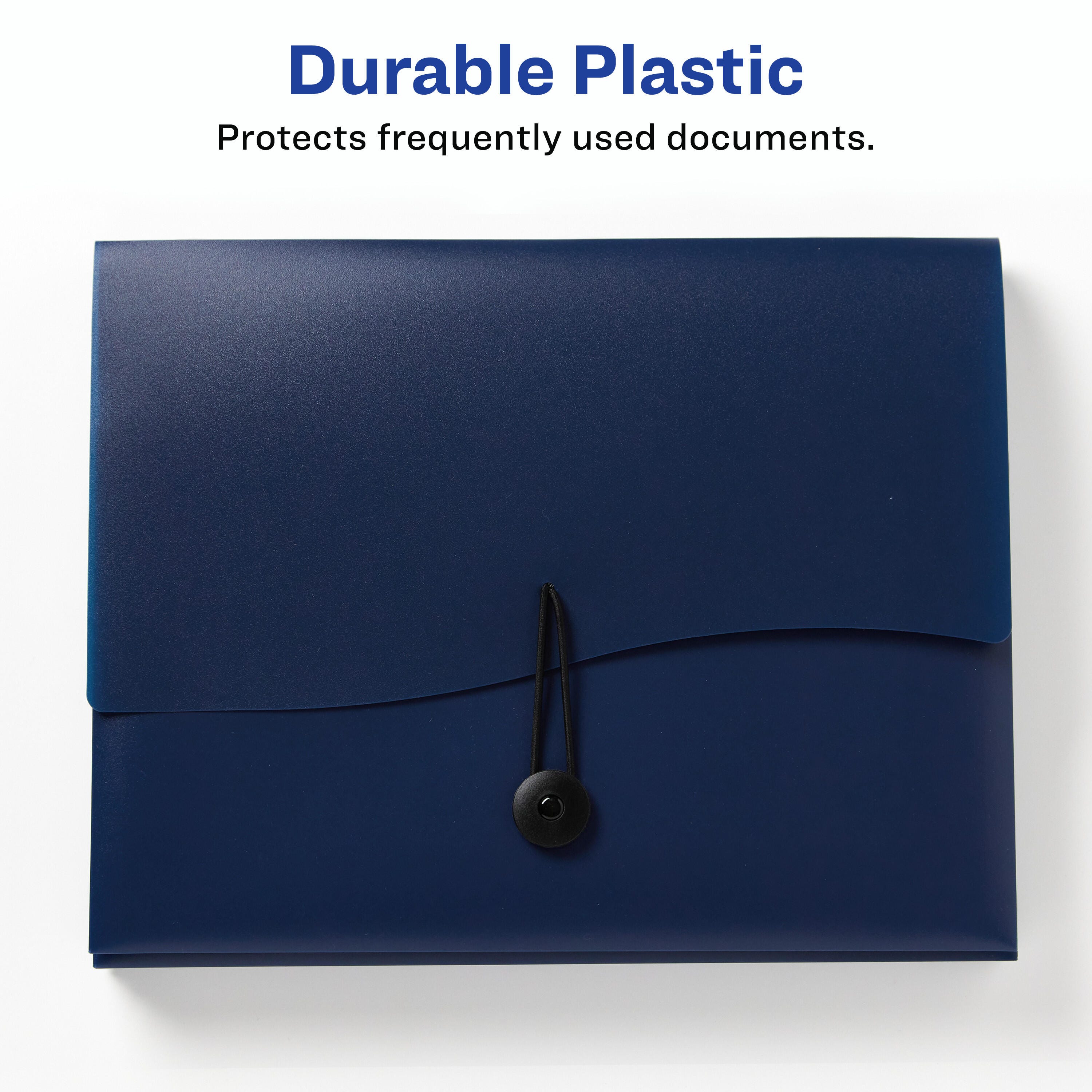 Keep all of your paperwork contained and organized in this unique and effective file folder from Avery®. This handy folder features 6 pockets that slide and expand upward to display the documents in each pocket. These folders are made of a durable poly material that stands up to repeated use. Each pocket can hold up to 40 letter-size sheets of paper, for a total maximum of 240 sheets! The folder features a flap closure secured with a strong elastic cord that holds the folder closed, even when full, to keep your documents safe.Features