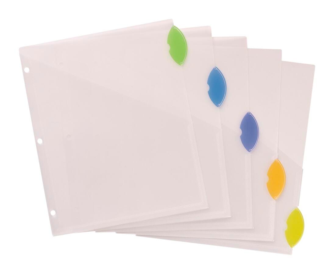 With these Insertable-style Edge Plastic Dividers with Pockets, you get a fashionable look, easy referencing and extra storage all in one. Letter-size dividers are made from durable, translucent plastic for long-lasting use and feature sturdy pockets for storing loose papers. Unique, oval tab design gives you a fashionable look while keeping your inserts from falling out. Simply customize and print your inserts for your five tabs using the free online templates and designs. Three-hole punched edge means the dividers are ready to use.