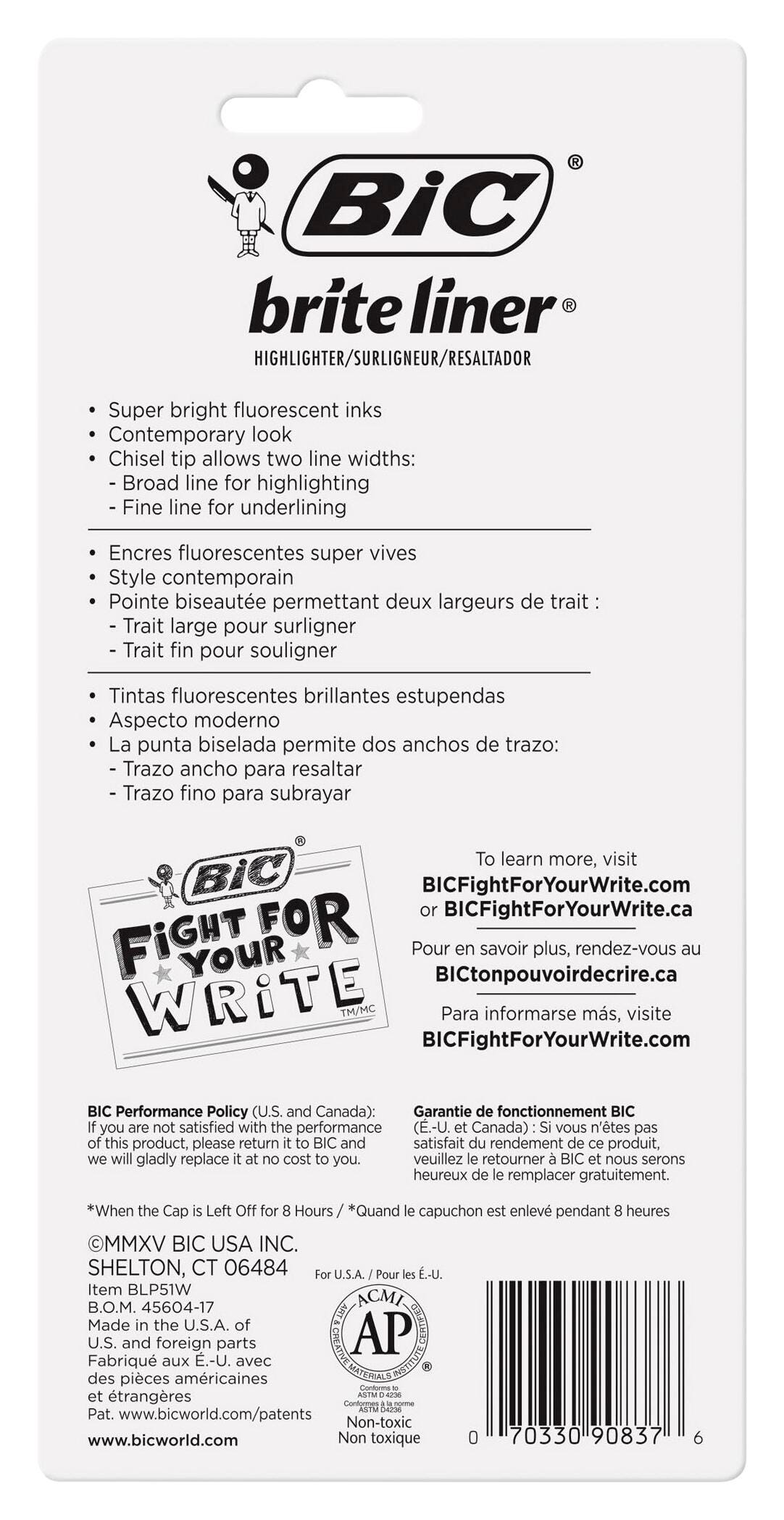 Whether you're organizing notes or underlining passages in a textbook, Brite Liner Highlighters make highlighting fun and easy. These highlighters come in five highly visible, fluorescent colors, allowing you to easily color-code and emphasize information. Each highlighter has a versatile, firm chisel tip that allows you to seamlessly switch between broad highlighting and precise underlining. Brite Liner Highlighters can be left uncapped for up to 8 hours without drying out. This pack contains one highlighter in yellow, pink, green, blue, and orange.