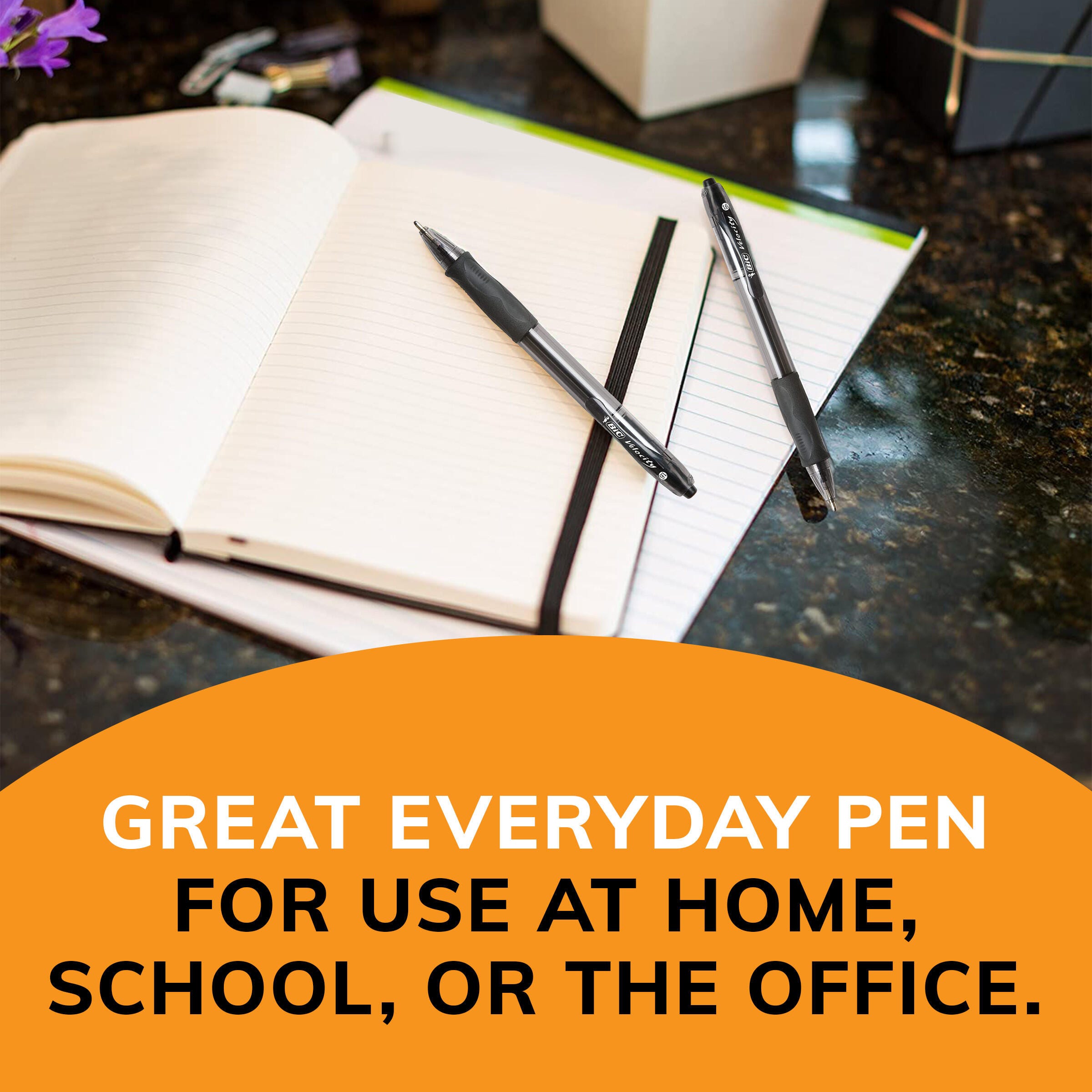 These ballpoint pens feature the Easy-Glide System, BIC’s exclusive ink technology for smoother writing and bolder, more vivid lines. Semi-translucent barrel matches ink color. Use plunger at top to retract the 1.6mm bold point. Barrel also features a contoured rubber grip for comfort and control, and a handy clip to attach pen to notebooks, pockets and more.