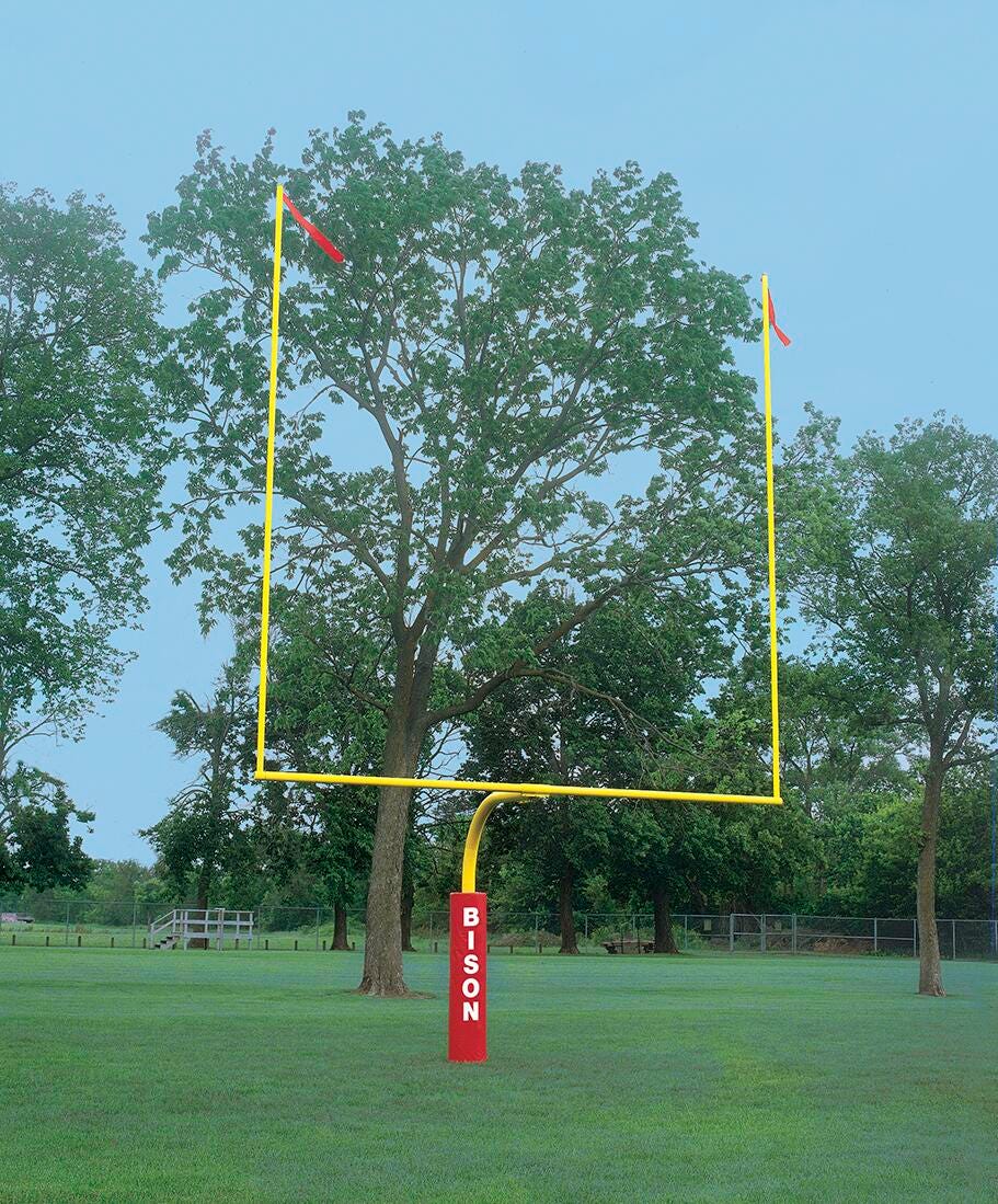 Sturdy and well-made football goalposts make the game. This popular 4-1/2 inch gooseneck styling and Bison’s exclusive PerfectGoal design make these high school-width goalposts an excellent value. The posts are buried 48 inches into the ground for stability. Comes with 60-inch setback and 20-foot-long aluminum uprights. The crossbars are 4-1/2 inch steel tubes, made to withstand weather and wear from game to game. Available in safety yellow for easy visibility.Features