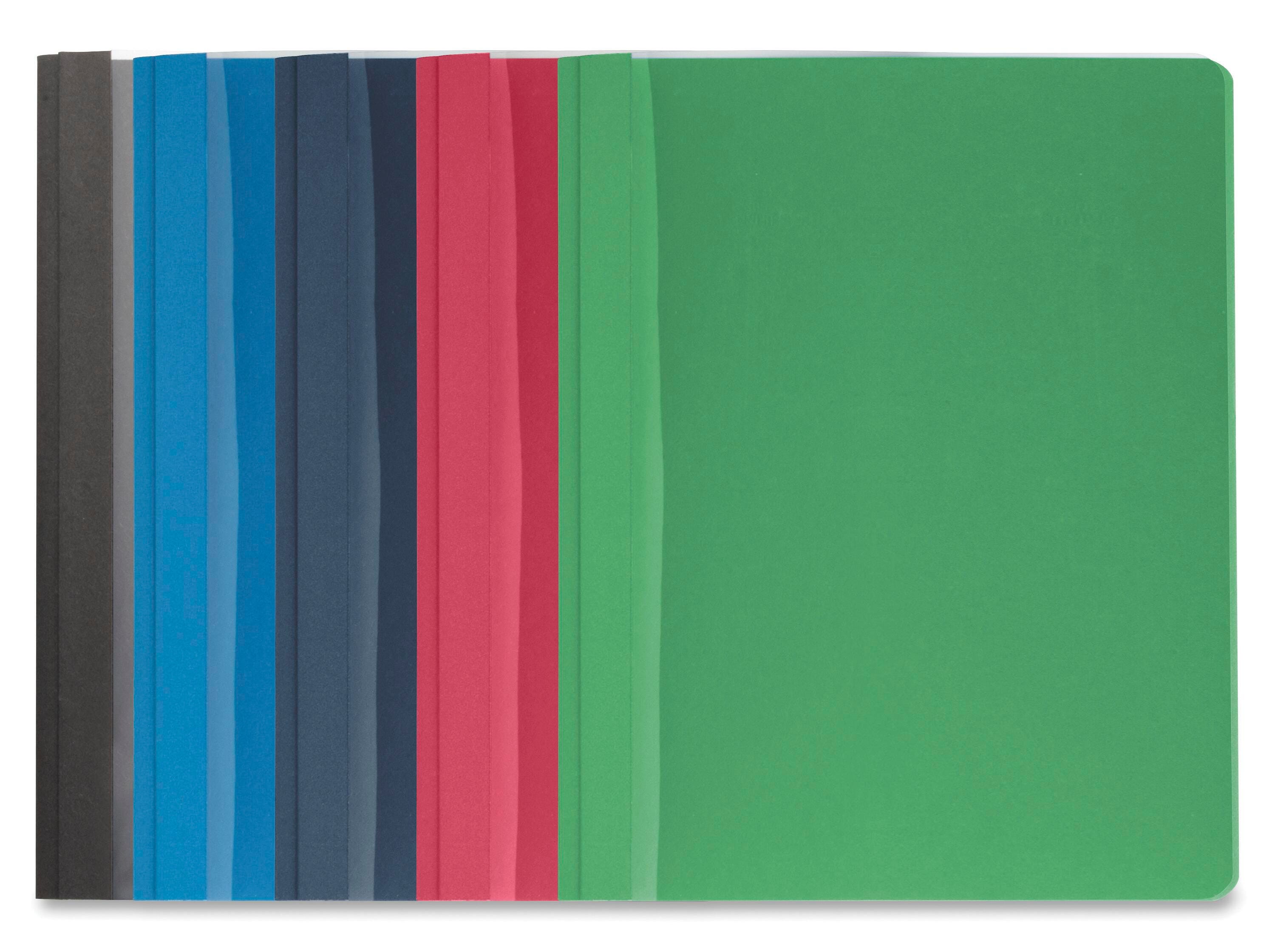 Report covers feature a clear cover for easy customization for your presentations and fasteners that hold a stack of papers up to 1/2 inch thick. Clear front cover is nonstick so it won't lift print from your reports. Traditional, textured paperback cover supports your important presentations. Interior, three double-prong fasteners hold up to 100 sheets of letter-size paper. Assorted colors include: red, green, dark blue, light blue, and black.