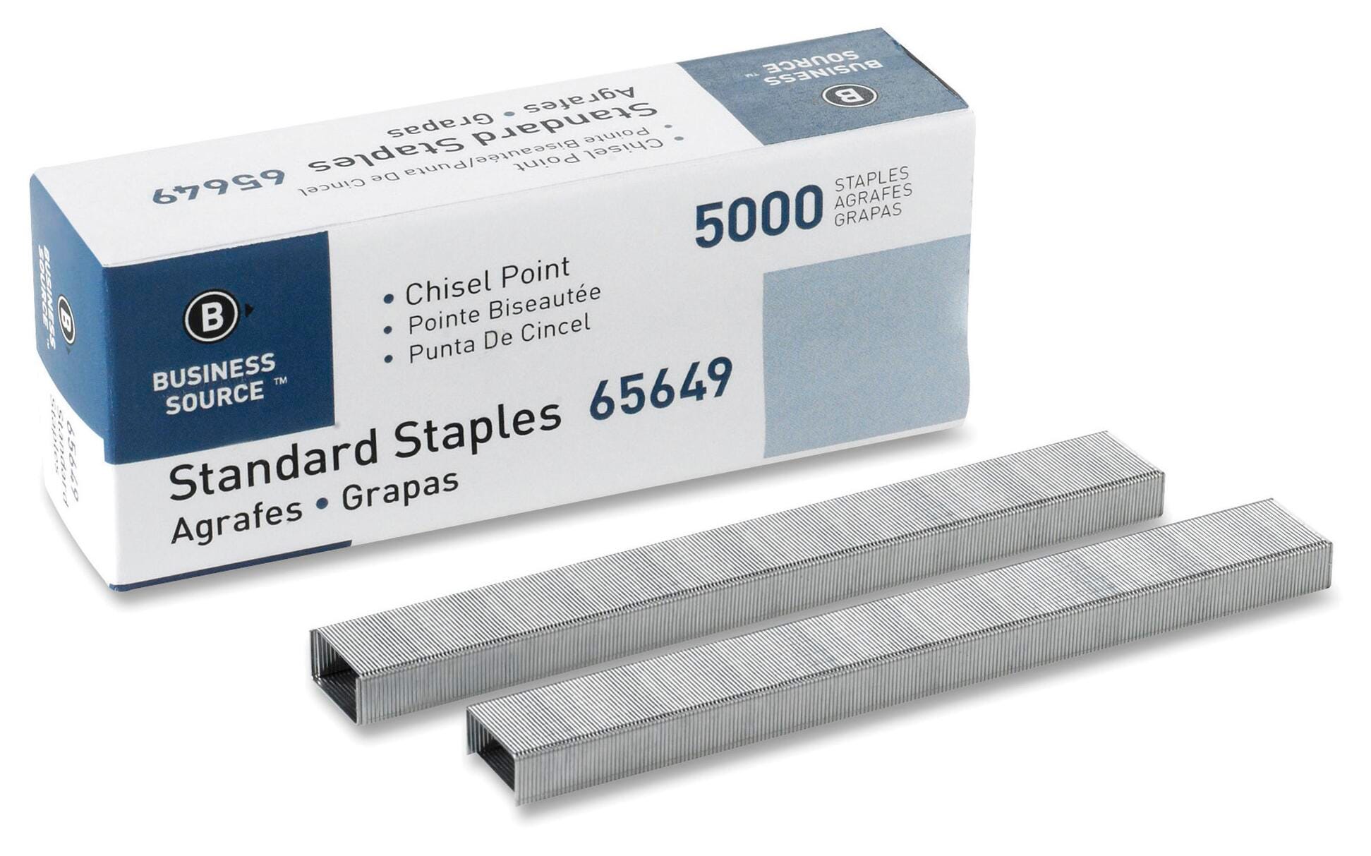 Business Source Chisel Point Standard Staples, 210 Per Strip, 1/4 Inches Leg, 1/2 Inches Crown, Holds 30 Sheet(s), Chisel Point, Silver, 5000 / Box