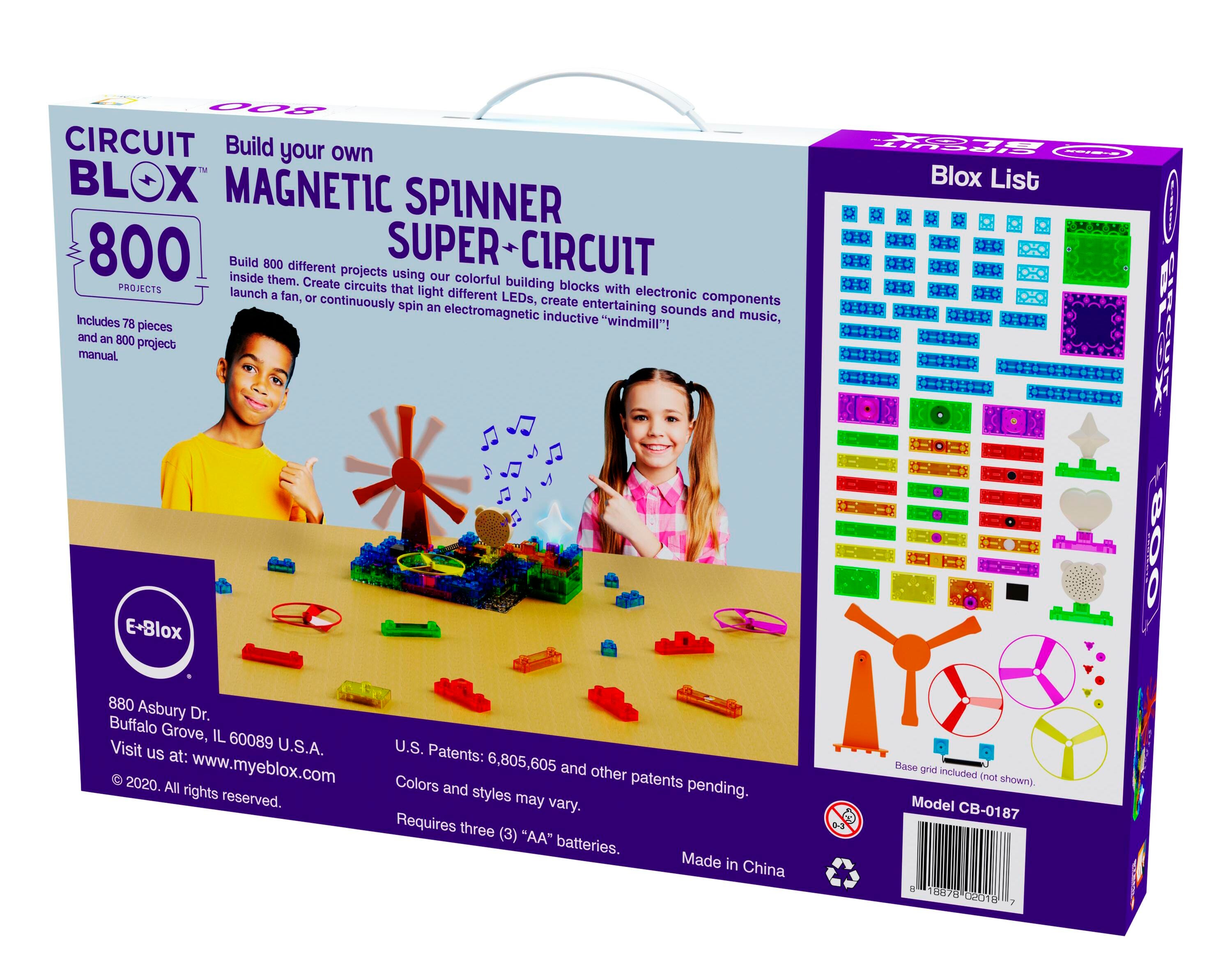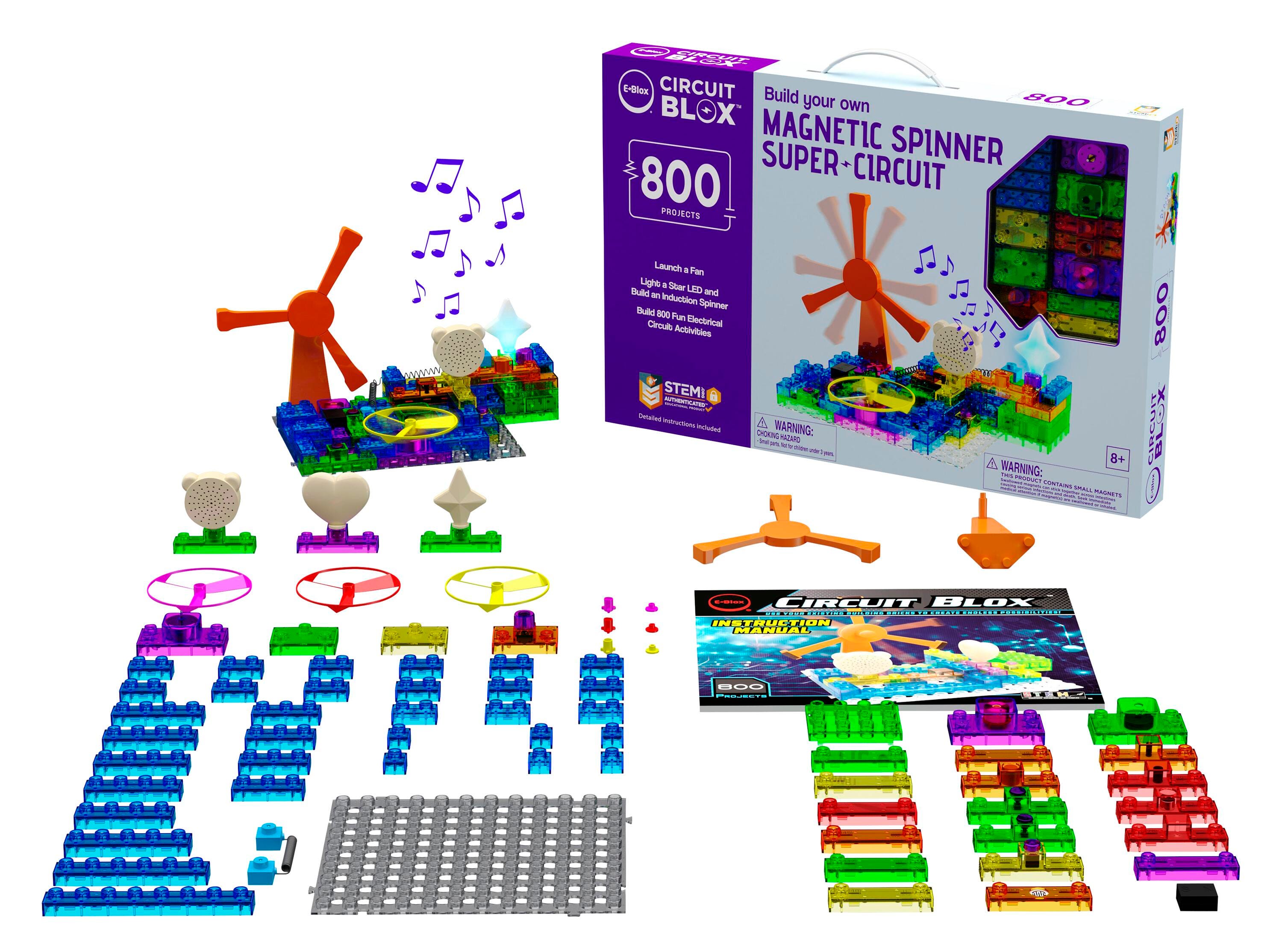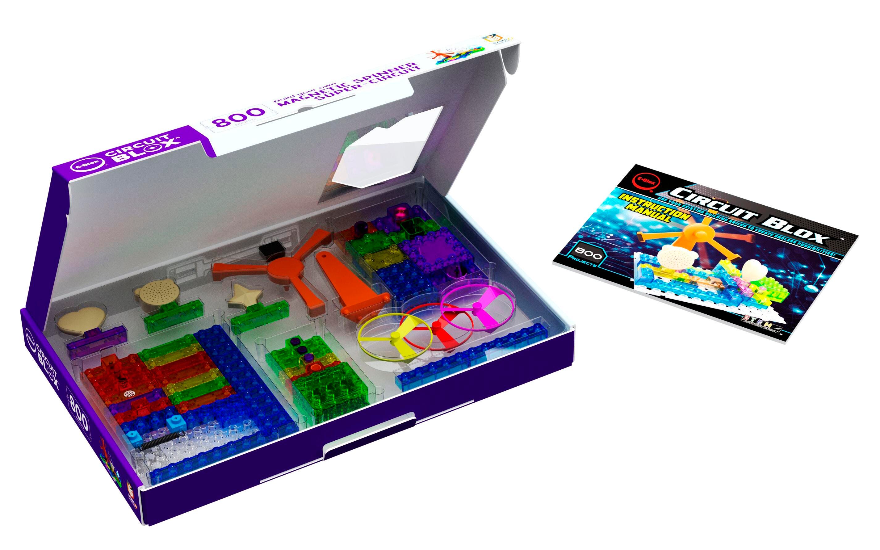 This kit provides hours of fun and educational play. The colorful building blocks contain electronic components such as a battery module, switches, LEDs, resistors, photoresistor, potentiometer, capacitors, inductor, transistors, magnetic windmill, motor, IC sound module, speaker, microphone and high impedance buzzer. Build 800 different 3D circuits that teach STEM and light a heart or star, spin a motor to launch a fan high in the air, play music, sirens and space battle sounds, build an alram clock and even spin a magnetic windmill!Features