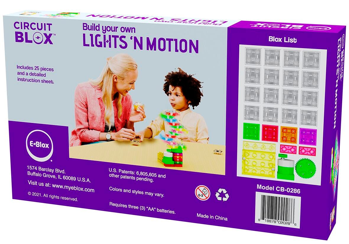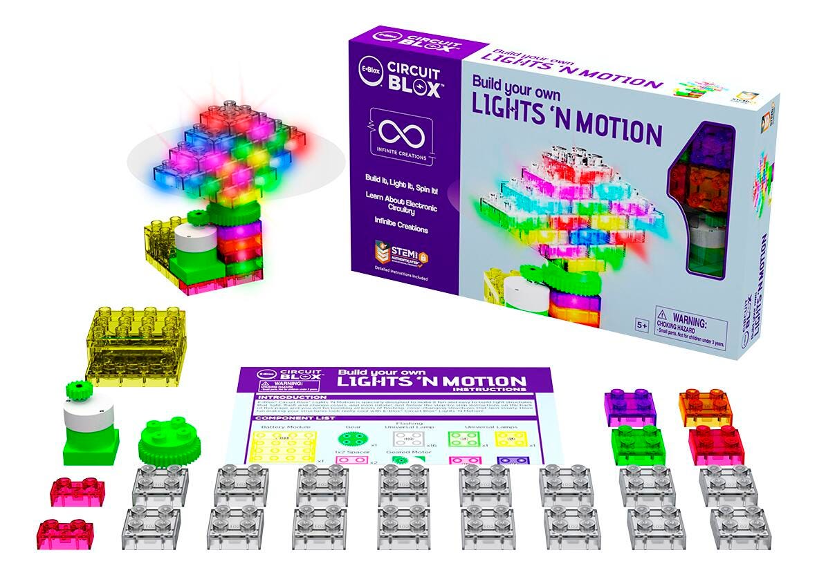 Colorful building blocks contain electronic components such as a battery module, LEDs, geared motor and gear. Build whatever structures come to your imagination that rotate, flash and change colors!Features