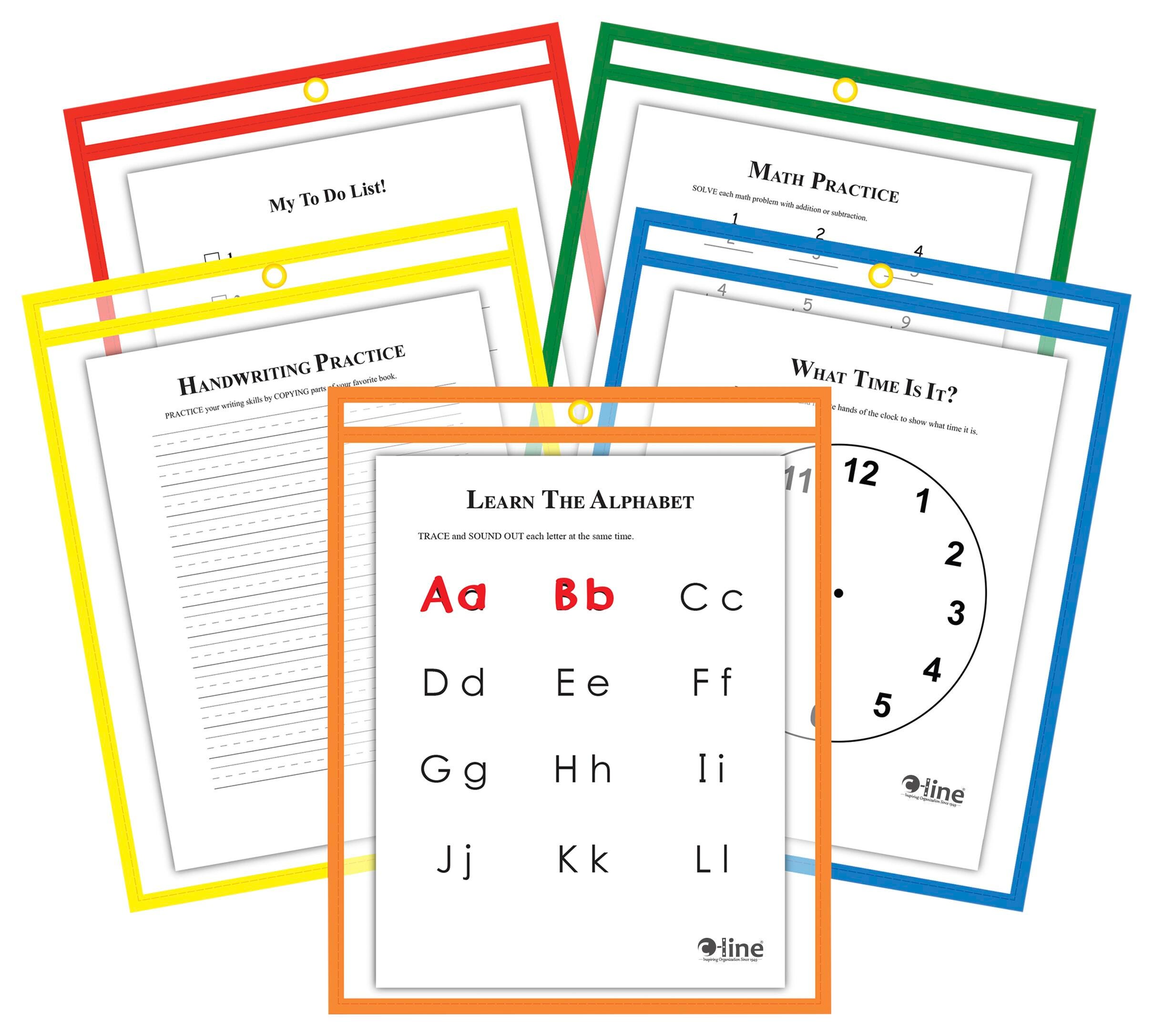 C-Line Reusable Dry Erase Pockets help to improve student skills and offer a resource to practice math problems, letters, writing skills or more. Provides an eco-friendly option by eliminating the need to copy worksheets over and over again. The pockets were created with durability to last. Cleans easily with soft dry cloth or tissue. Features a convenient eyelet for hanging. Assortment includes 5 each primary colors: red, orange, yellow, green and blue. Measures 9 x 12 inches. Box of 25.
