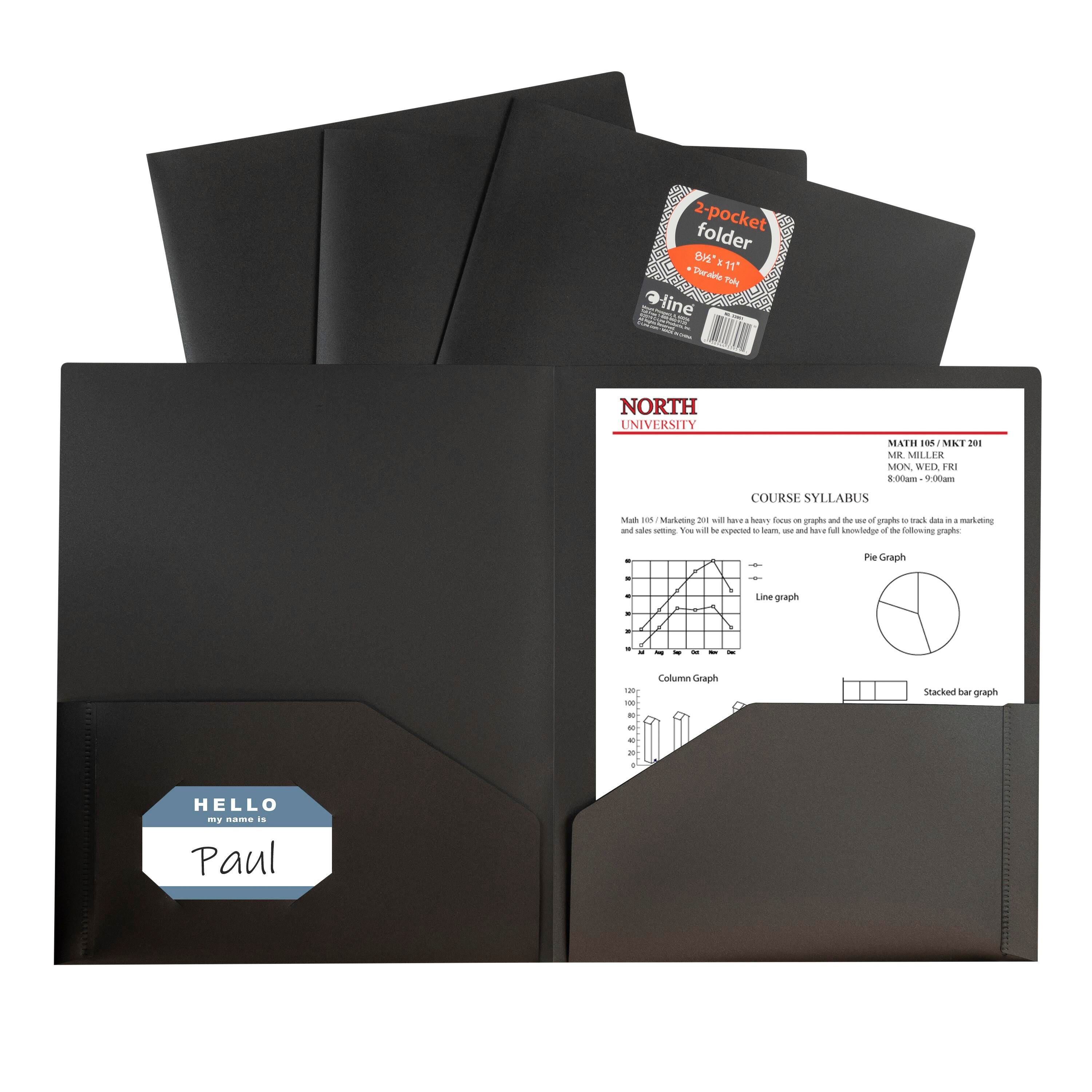 Two-pocket heavyweight polypropylene portfolio folders hold papers and resist tearing. Holds 8-1/2 x 11 inch sheets of paper. Features business card slot. Does not include 3 hole punching or prongs. Sold as a pack of 25 black folders.Features