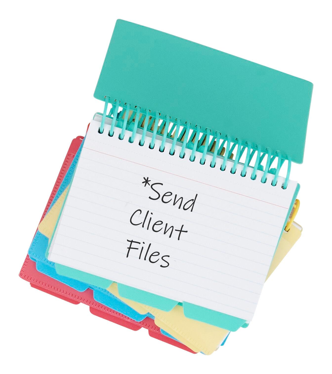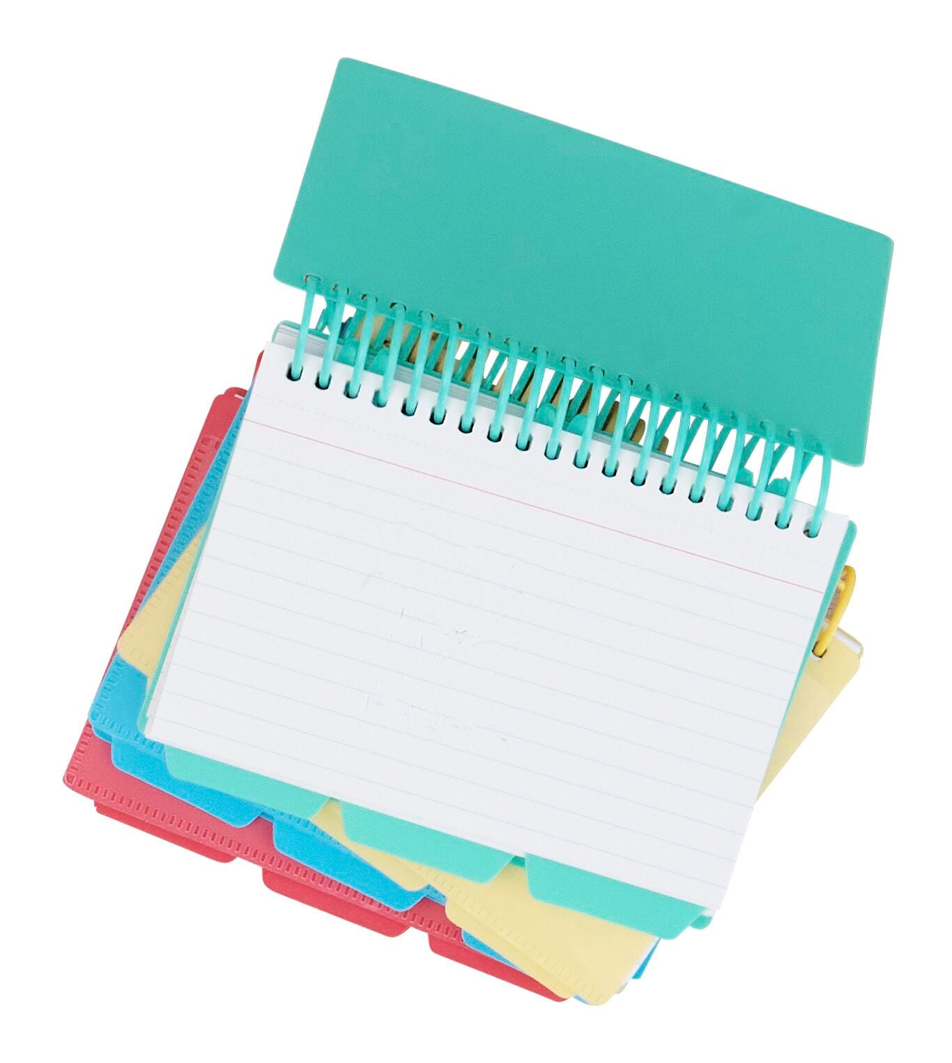 Spiral Bound Index Card Notebook keeps project notes together in one convenient, portable notebook. Great for class notes, assignment details and more. Features clear view cover. Includes three repositionable, tabbed poly dividers, and 60 perforated 3 x 5 inch index cards. Assorted Tropic colors include: Seaside Blue, Seafoam Green, Sunny Yellow, and Sunset Red . Sorry no color choice.