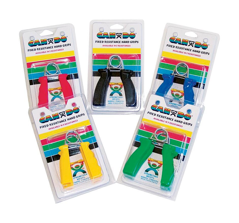 CanDo ErgoGrip Hand Exerciser is sold in pairs. Weight equals the amount of force needed to fully compress the fixed ErgoGrip handles. The new CanDo resistance sequence on these ergonomic grips covers any needs from the earliest stages of rehabilitation after stroke (yellow) to advanced athletic training (black). The force equivalent doubles with each level so you can work your way up. ErgoGrip measures 4 W x 1 D x 5 L inches. Set of 2.