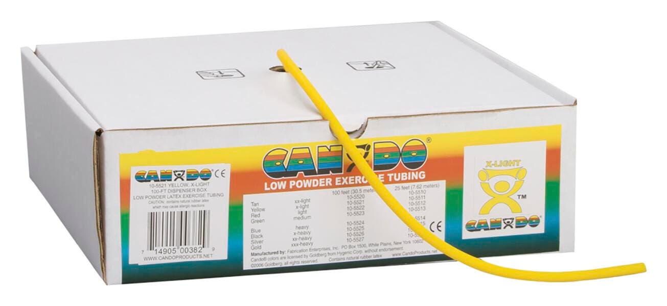 CanDo high quality latex resistive exercise tubing has been used in clinics for rehabilitation, conditioning and training since 1987. It has become a staple of many physical therapy and athletic training programs. CanDo exercise tubing is an economic solution for upper and lower body exercise. Effective when used alone, or with handles and anchors. CanDo is licensed to use the Thera-Band color sequence so resistance level is easily identified. CanDo low powder exercise tubing is made of natural rubber latex, which may cause allergic reactions. For those with latex sensitivities, there are latex-free alternative offerings of CanDo exercise tubing.Features
