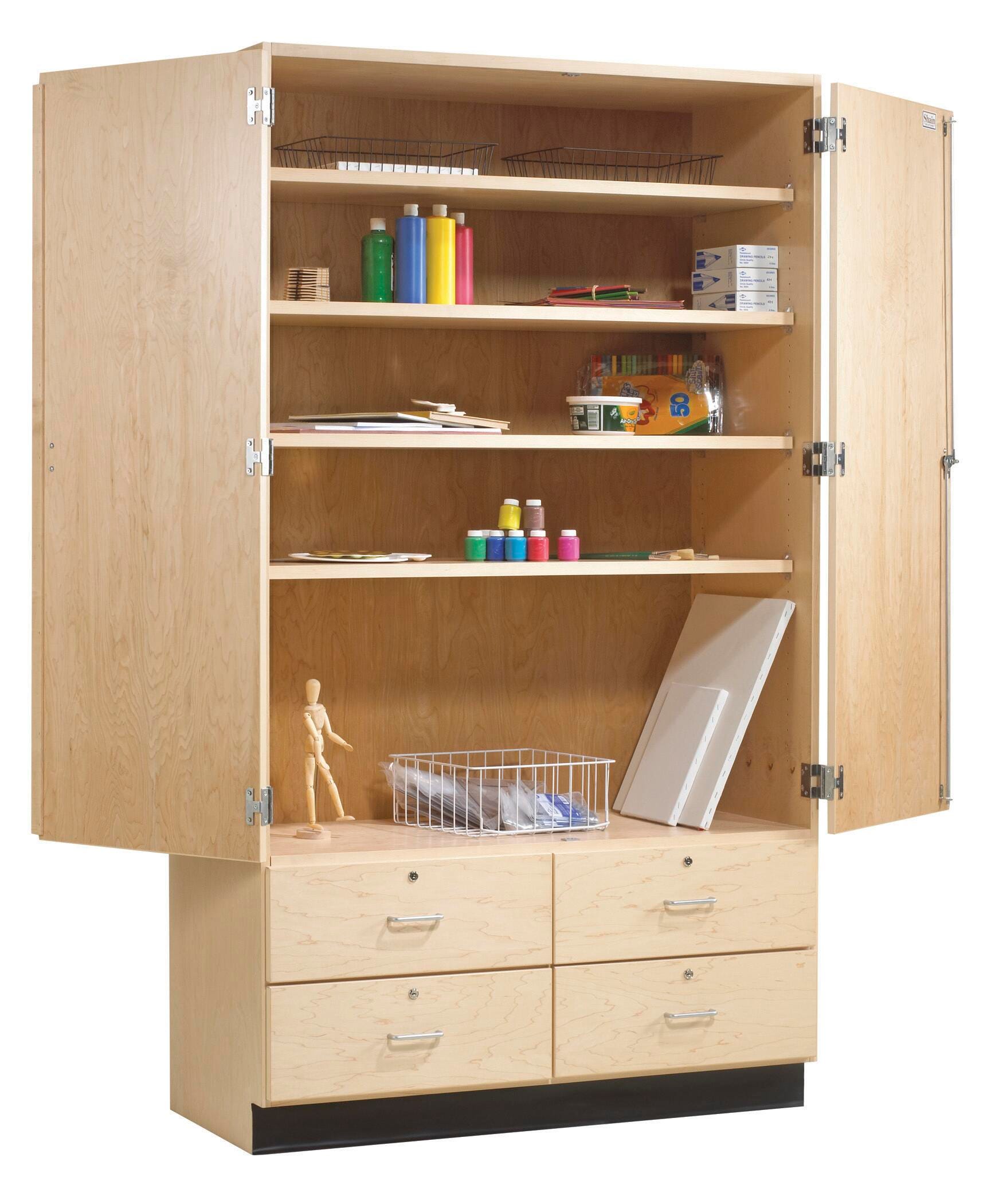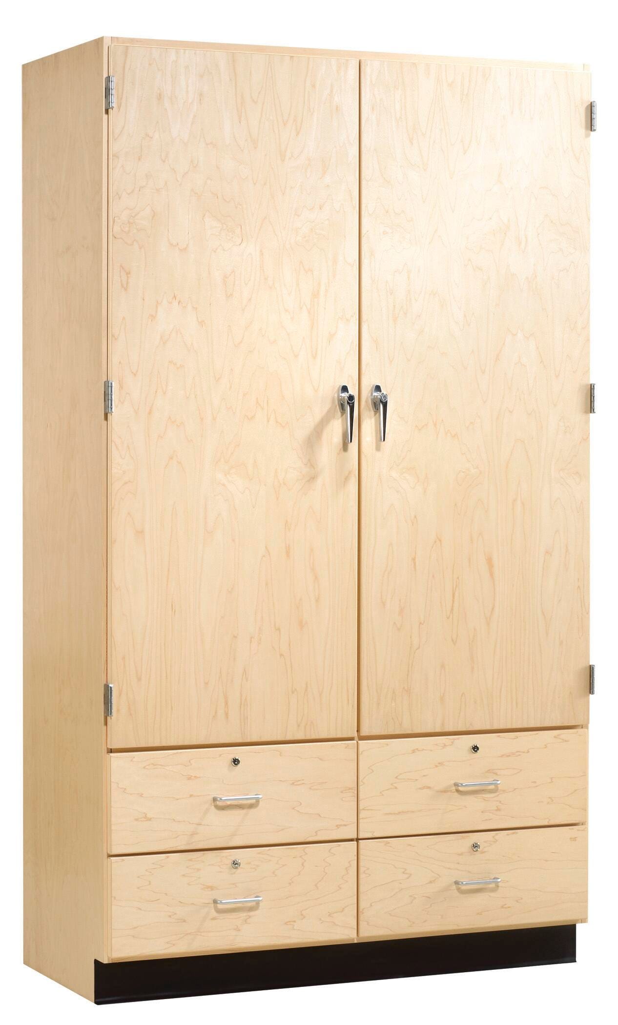This Tall Storage Cabinet by Diversified Spaces is constructed of solid hardwood, solid maple, maple veneers, and highlighted by an earth-friendly UV finish. Upper section consists of four adjustable 1 inch shelves and one fixed bottom shelf. The locking doors provide secure storage, while the lower section consists of four locking drawers (22-3/4 W x 19-3/4 D x 8-1/4 H inches) that are fully dovetailed. Limited lifetime warranty.