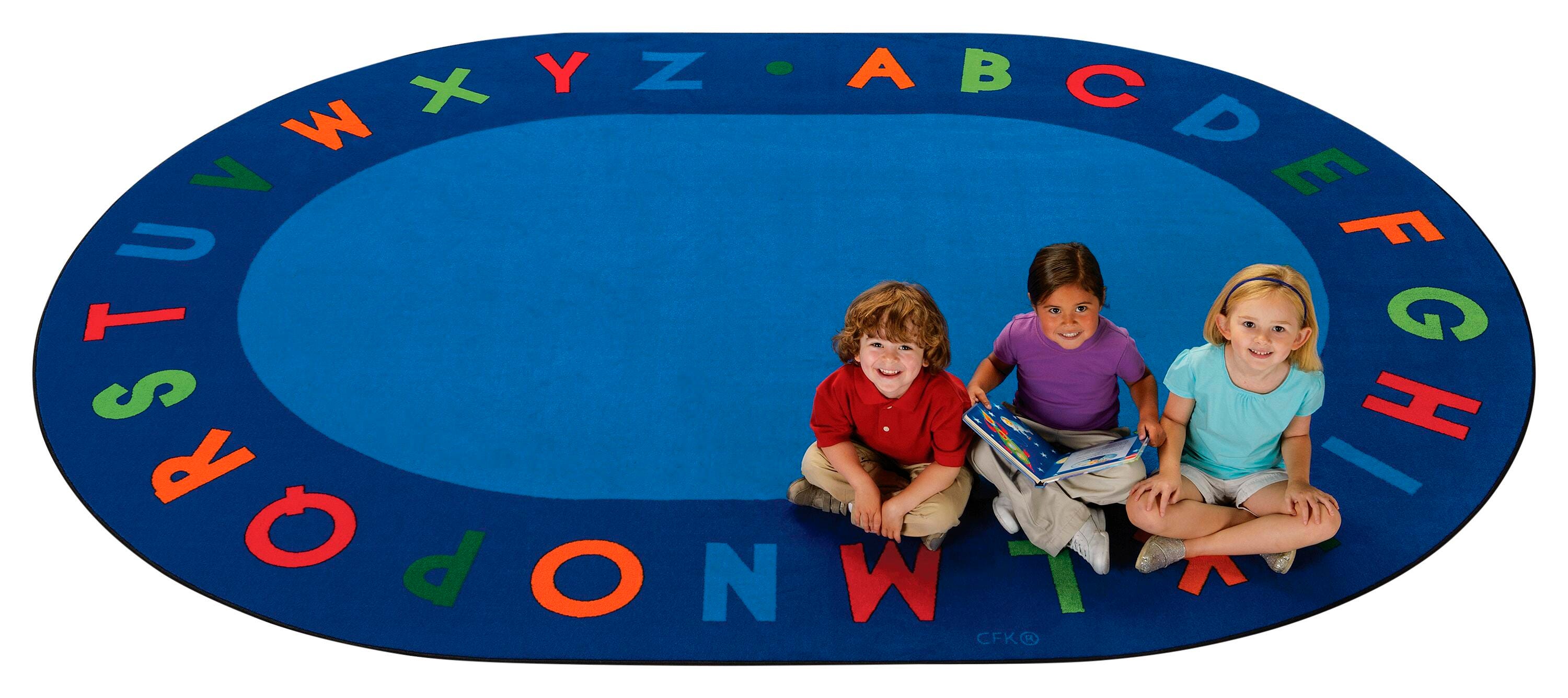 Carpets for Kids presents their premium Alphabet Circletime Carpet. This oval carpet introduces literacy into any educational space - the playroom, preschool, or classroom. Designed to be plush and stain resistant, this classroom carpet makes for the perfect seating carpet for both storytime and circle time. Simple alphabet border with chunky letters ensures letter recognition is easy for little learners just learning their first letters. Available in several sizes to best match your space. Please select the correct space when ordering.Features