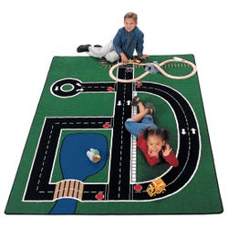 Drive around the block with this easy-to-navigate Neighborhood Carpet. This classroom carpet features large roadways to accommodate various vehicles students bring to the carpet. Available in several sizes.