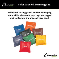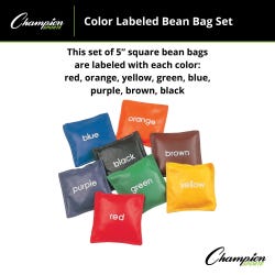 Make learning colors more fun with these Color-Labeled Bean Bags from Champion Sports. The soft vinyl bags measure 5 inches and are filled with plastic beads. These colorful bean bags are clearly labeled with the name of the bag's color. They are great for early development and provide an interactive and concrete way to reinforce the skill of identifying colors. This set contains a blue, orange, black, brown, purple, green, yellow, and red bean bag.Features