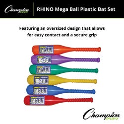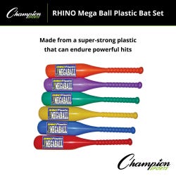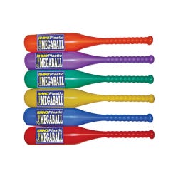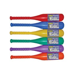The RHINO Plastic Mega Ball Bat will have beginners hitting home runs in no time! These oversized bats are great for helping children with hand-eye coordination and grip. Made of super-strong, colorful plastic, they are built to withstand the biggest hits and long games. This set includes 6 bats measuring 24 inches each, with one in each of the following colors: red, blue, green, yellow, orange, and purple.Features